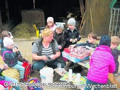RIEHE (Ka). Kühe sind nicht lila und Milch stammt nicht aus dem Tetra-Pack! Diese Erkenntnis ist auch für die Kinder der Froschgruppe nicht neu. Schließlich sind sie auch sie nicht grün, wenngleich sie sehr neugierig, aufgeschlossen und interessiert sind und vor Freude hüpfen, wenn ein Ausflug ansteht. Die Froschgruppe des Evangelischen Kindergartens besuchte mit ihren Erzieherinnen Jeannine Schröder und Eva Zomack den Bauernhof der Familie Volker in Riehe. Im Mittelpunkt standen die Natur und die natürlichen Abläufe der Landwirtschaft. Mit großer Begeisterung widmeten sich die Gäste den Tieren, besonders aber dem Nachwuchs. Sie streichelten die Kälbchen und fütterten die Kuh-Gesellschaft. Das frische Produkt "Milch" wurde mit Kakao gemischt und schmeckte den neuen Hof-Praktikanten besonders gut. Landluft macht Appetit auf mehr und so ruhten sich die kleinen Frösche im Stroh aus und nahmen eine ausgiebige Vesper zu sich. Das Stroh eignete sich aber auch für Versteckspiele und zum Toben.