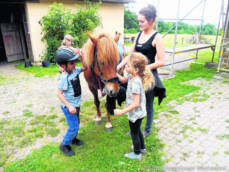 Die Kinder wurden täglich vormittags mit einem Bulli von zu Haus abgeholt, verbrachten den Tag dann auf dem "Twelenhof" und wurden am späten Nachmittag wieder zu ihren Eltern zurück gebracht. Ziel des besonderen Ferienangebotes sollte sein, solchen Kindern einen erlebnisreichen Mini-Urlaub zu ermöglichen, die mit ihren Eltern während der Sommerferien sonst zu Haus geblieben wären. Zusammen mit anderen Kindern sollten sie die Gelegenheit haben, sich zu erholen, an der frischen Luft zu spielen, Tiere zu erleben, die Natur zu entdecken - und jede Menge Spaß zu haben. Was am meisten Spaß gemacht hat, das war für die Kinder auf Nachfrage sofort klar: "Das Reiten!" Auf dem Rücken der sehr geduldigen Islandpferde Dreyri und Slotta durften jeweils vier Kinder unter Anleitung von Reitpädagogin Martina Platen allein oder zu zweit im Sattel sitzen, mal mit dem Blick nach vorne, mal in die umgekehrte Richtung, mal liegend oder sogar kniend. Nach den Reiteinheiten halfen die Jungen und Mädchen, die Therapiepferde abzusatteln, ihnen die Hufe auszukratzen und die Tiere zu versorgen. Wer gerade nicht mit Reiten beschäftigt war, der konnte beispielweise unter fachkundiger Anleitung von Kinderschutzbund-Mitarbeiter Joachim Legit aus Haselnusszweigen kleine Mäuse oder ein lustiges Fangspiel schnitzen oder aus Weidenzweigen, Wolle und Federn einen Traumfänger basteln. Einige Kinder gestalteten mit Stoffmalstiften ein T-Shirt und malten ihr Lieblingstier auf den Stoff. Andere halfen eifrig in der Küche mit, wenn das Mittagessen zubereitet werden sollte oder kochten aus selbst gesammelten Himbeeren und anderen Früchten leckere Marmelade. Sehr beliebt war auch die Verkleidungskiste. In der Mittagspause war das Kartenspiel "UNO" bei den Kindern sehr beliebt. Im Schatten einer großen Eiche spielten sie mit den erwachsenen Betreuerinnen und Betreuern auf einer Picknickdecke so manche Runde. Wer Ruhe brauchte, wiegte sich eine Weile in der Hollywoodschaukel hin und her oder ließ sich ein Buch vorlesen. Therapiebegleithündin "Lotte" war stets mittendrin im Geschehen und brachte unermüdlich Bälle und Äste wieder, die die Kinder geworfen hatten. Auch beim Ausflug in den nahen Wald war sie dabei, wo die Jungen und Mädchen am Bach spielen oder an einem langen Seil den Hang hinauf klettern konnten. Ein besonderes Ereignis war für alle Beteiligten, dass während der Ferientage ein Fohlen auf dem "Twelenhof" zur Welt kam. Hingerissen beobachteten Kinder und Erwachsene, wie das Fohlen auf der Weide die ersten staksigen Schritte probierte und wie es von seiner Mutter umsorgt und gesäugt wurde. Am Ende freute sich Kinderschutzbund-Mitarbeiter Albrecht Schäffer über gelungene Ferientage und dankte den beiden Reitassistentinnen Berit Platen und Imke Buchholz sowie den ehrenamtlichen Helferinnen für ihre Mitarbeit - und, last not least, der Bürgerstiftung Schaumburg für einen großzügigen Zuschuss, ohne den die Ferientage erst gar nicht möglich gewesen wären.