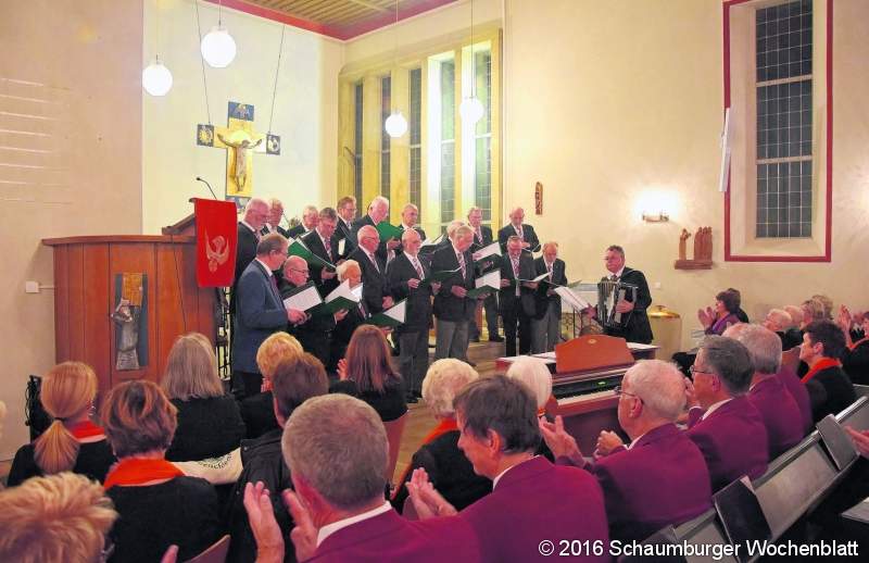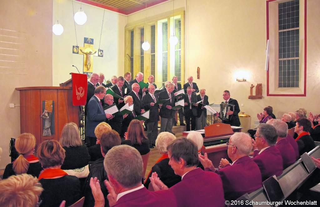 KRANKENHAGEN (ste). Beim Chorkonzert des MGV Krankenhagen in der Erlöserkirche konnte Chorleiterin Rita Lüse zufrieden sein mit den Leistungen "ihrer" Männer. Die hatten sich kräftig Schale geworfen, die Chorkleidung frisch gebügelt und standen wie eine Eins in der Kirche, wo sie vor allem Gäste aus den befreundeten und teilnehmenden Chören begrüßten mit "Ich wollte nie erwachsen sein" und "Halleluja". Den Anschluss machten der Gesangverein Germania Uchtdorf, dann folgten die Vereinigten Chöre Rinteln, die unter anderem mit "Music is my life" begeisterten, bevor der gastgebende Verein aus Krankenhagen wieder auf die Kirchenbühne kam mit "Mein kleiner grüner Kaktus". Aufgebaut im Gemeinderaum der Kirche war ein stattliches Buffet für die Aktiven und Gäste, doch zuvor überzeugten noch die Polyhymnen aus Möllenbeck mit "Über 7 Brücken" und der Kirchenchor Krankenhagen mit "Sing mir ein Halleluja". Als zum Schluss des Konzertes der Gesangverein Krankenhagen gemeinsam mit dem Kirchenchor "Dank an die Freude" schmetterte, gab es lang anhaltenden Applaus. Foto: ste