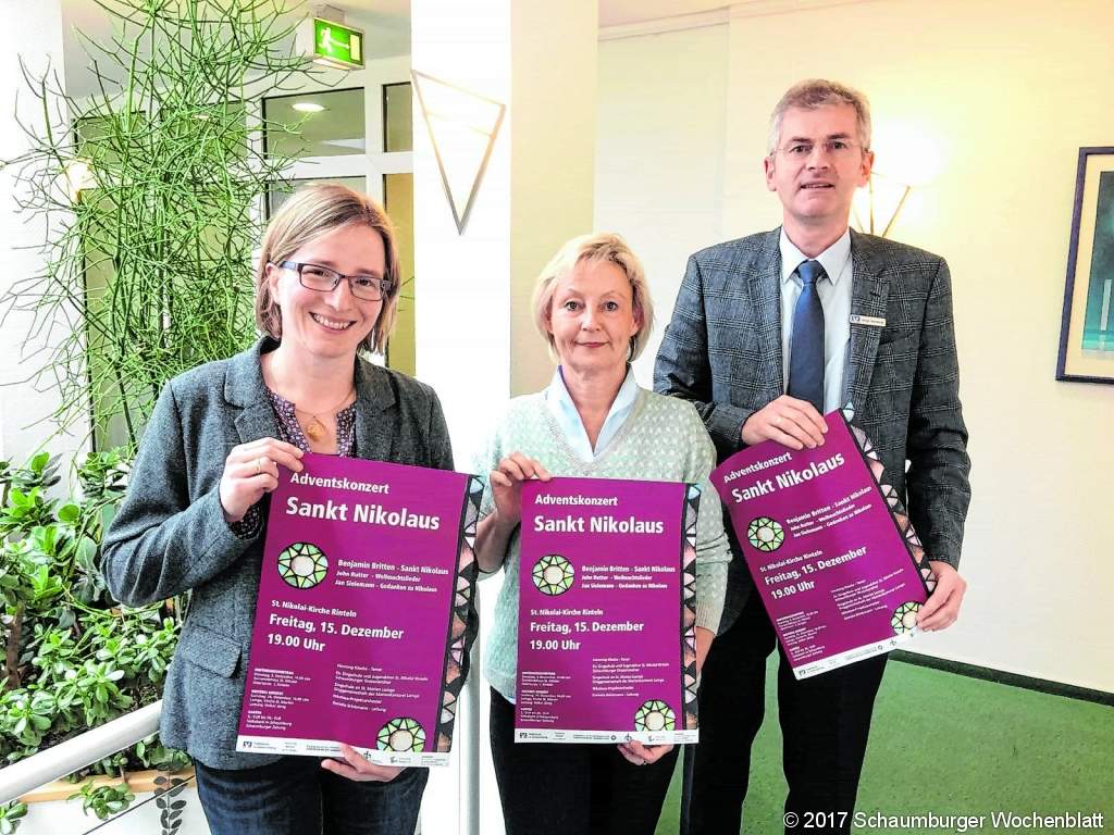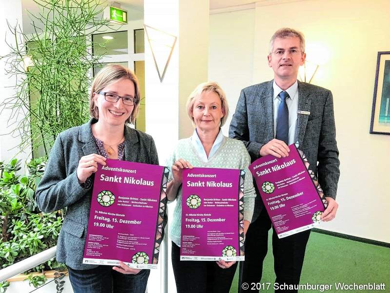 Wer aber war jener Mann, den bei uns jedes Kind als Überbringer von Geschenken kennt? - Welche Legenden sich rund um sein Leben ranken, erzählt in neun Stationen die Kantate "Sankt Nikolaus" des englischen Komponisten Benjamin Britten, die als Hauptwerk des Abends in deutscher Sprache aufgeführt wird. Benjamin Britten (1913-1976) ist Englands bedeutendster Komponist des 20. Jahrhunderts. Er hat eine ganz eigene Klangsprache entwickelt, durch die er schon zu Lebzeiten zu Berühmtheit gelangte. In der Musik der Nikolaus-Kantate seien Stimmungen, erläuterte Kreiskantorin Daniela Brinkmann beim Pressegespräch, ganz unmittelbar und eindrucksvoll zu erleben: Wie eine Seefahrt bei Unwetter etwa oder Nikolaus‘"Einsamkeit im Gefängnis". Britten komponierte das Stück als Auftragswerk für das 100. Jubiläum des Lancing College und passte es eng an die Gegebenheiten der Schule an. So treten mehrere Chöre auf den Plan, es gibt einige Passagen für Kinderstimmen, und der Orchesterpart wird von Jugendlichen bewältigt. Nur für den Solistenpart des Nikolaus ist ein professioneller Sänger vorgesehen. Zum Orchester zählen neben den Streichern ein großes Schlagwerk, Orgel und ein Klavierduo. Das Publikum verbindet sich an zwei Stellen mit den Ausführenden und ist hierbei zum Mitsingen von Chorälen aufgefordert. In der Komposition "Gedanken zu Nikolaus" von Jan Sielemann wird das populäre und volkstümliche Nikolaus-Lied "Lasst uns froh und munter sein" mit der Sehnsucht und dem Wunsch nach Frieden verbunden. Im dritten Teil des Abends kommen Weihnachtslieder von John Rutter zu Gehör. John Rutter (*1945) ist inzwischen ebenfalls ein populärer englischer Komponist und Chorleiter. Seine Chor- und Kirchenmusikwerke, die oft Anklänge an Filmmusik haben, erfreuen sich großer Beliebtheit. Im Konzert werden fünf seiner eingängigen Weihnachtshymnen mit Orchesterbegleitung aufgeführt. - Das Konzert wird von einem großen Chorensemble gestaltet: Zusammen mit dem Schaumburger Oratorienchor singen die Singgemeinschaft der MarienKantorei Lemgo sowie die Kinder- und Jugendchöre der Singschulen Sankt Nikolai Rinteln und Sankt Marien Lemgo. Die Rolle des Nikolaus übernimmt der Solist Henning Klocke (Tenor). Im "Nikolaus-Projektorchester" wirken Pultführer der Nordwestdeutschen Philharmonie Herford sowie weitere Musiker aus der Region mit. Die Leitung hat Kirchenkreiskantorin Daniela Brinkmann, die bereits am Dienstag, dem 5. Dezember, in einem Vortrag mit Klangbeispielen (ab 19 Uhr im Gemeindehaus an der Ostertorstraße) einen Vorgeschmack auf das Konzert vermitteln wird. Karten zum Preis von fünf bis 20 Euro können ab dem kommenden Montag, dem 20. November im Vorverkauf bei der Schaumburger Zeitung und bei der Volksbank in Schaumburg erworben werden. Foto: km