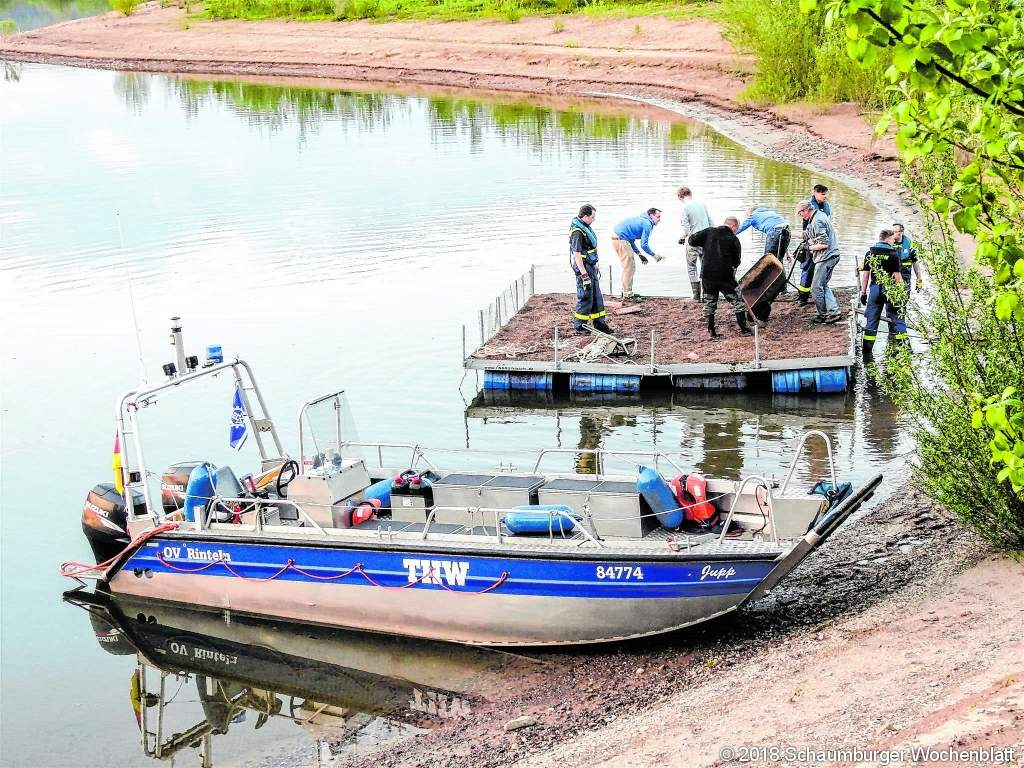 HOHENRODE (ste). Sturm und Hochwasser hatten das Floß für die Flussseeschwalben stark beschädigt. Es wurde vom THW Ortsverband Rinteln zur Reparatur geborgen und abtransportiert, repariert und jetzt wieder angeliefert. Ehrenamtlichen Naturschützer des NABU Rinteln machten sich an die Arbeit, die schweren Einzelteile am Ufer des westlichen Teiches zu montieren. Mehr als dreißig Tonnen sorgen dafür, dass das schwere Brutfloß auf dem Wasser bleibt. Die mussten unterhalb des Rahmens befestigt werden: "Acht Elemente haben wir mit großen Schrauben und Muttern miteinander verbunden", erläutert Dr. Nick Büscher, Vorsitzender des NABU Rinteln. Schwere Eisenmatten sorgen dafür, dass der Kies und das vorher ausgelegte Vlies auf der Metallkonstruktion liegen bleiben. Nachdem die Montage der Einzelteile der etwa 15 Quadratmeter großen Brutinsel erledigt werden konnte, musste das Floß mit Hilfe des THW wieder anrücken, um das tonnenschwere Floß auf das Wasser zu ziehen. Zuvor mussten noch Dachpfannen und Holzhäuschen verteilt werden, die die jungen Flussseeschwalben vor Sonne und Beutegreifern schützen sollen: "Ohne die Unterstützung des THW wäre diese Aktion so nicht möglich gewesen", erläutert Büscher und dankt dem Technischen Hilfswerk für die gute Unterstützung. Gerade noch rechtzeitig wurde das Floß instandgesetzt und zu Wasser gelassen. Denn das erste Flussseeschwalbenpaar wurde bereits gesichtet und kann bei seiner Flugshow beobachtet werden: "Wir sind gespannt, wie viele Paare sich in diesem Jahr in der Auenlandschaft einfinden werden", so Büscher abschließend. Dieses Jahr werden die flinken Flugkünstler das fünfte Jahr in Folge ihr Brutgeschäft in der Auenlandschaft Hohenrode verrichten. Foto: privat