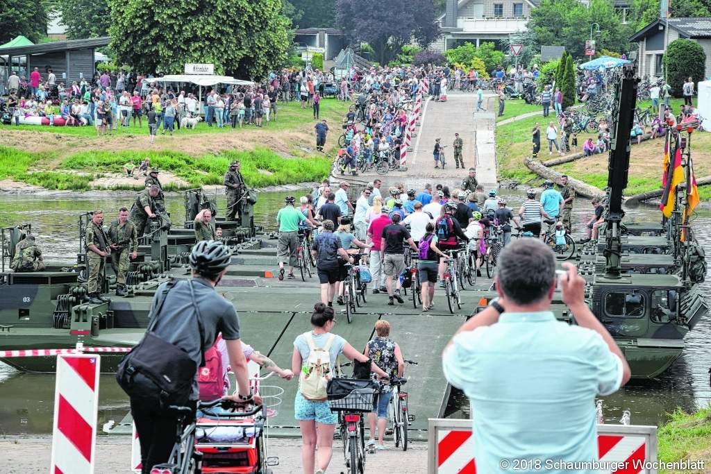 RINTELN (ste). 55 Kilometer autofreie Strecke zwischen Rinteln und Bodenwerder, geschätzte 62.000 Teilnehmer, trockene 20 Grad, acht Stunden gesperrte Straßen und jede Menge Erlebnismöglichkeiten entlang der Strecke sind die technischen Daten eines "Felgenfestes im Wesertal", das schöner und stressfreier wohl kaum sein konnte. Polizei und Rettungsdienste bilanzierten so gut wie keine Einsätze, schwere Verletzungen wurden nicht gemeldet, der Fährbetrieb in Großenwieden durch Pioniere der Bundeswehr funktionierte einwandfrei und wieder einmal war genau hier die Stelle, an der sich die meisten Besucher sammelten und wo die Schätzungen über die Teilnehmerzahl vorgenommen wurden. Die Bundeswehr hatte sich in diesem Jahr dazu entschieden, auf die Pontonbrücke zu verzichten und stattdessen einen Fährbetrieb mit einem Amphibienfahrzeug eingerichtet. Damit konnten mehr als 100 Radler gleichzeitig über die Weser gebracht werden. Eine Attraktion, die besonders viele Radler aus Richtung Rinteln und Hameln anlockte. Wer Lust und Laune auf Kombinationen von Bahn, Schiff und Rad hatte, für den gab es verschiedene Angebote der Nord-West-Bahn, der Deutschen Bahn und der "Flotte Weser", wo während des Felgenfestes die Mitnahme von Rädern kostenfrei möglich war. Unterwegs auf der Strecke gab es immer wieder Möglichkeiten zur Versorgung, und die wurden auch reichlich genutzt. Rinteln hatte als Start- und Zielort des Felgenfestes den beliebten Bauernmarkt mit regionalen Produkten im Angebot und wer kurz vor Ende des Felgenfestes über diesen Markt schlenderte, stand häufig vor leeren Tresen: "Alles verkauft!" Foto: ste
