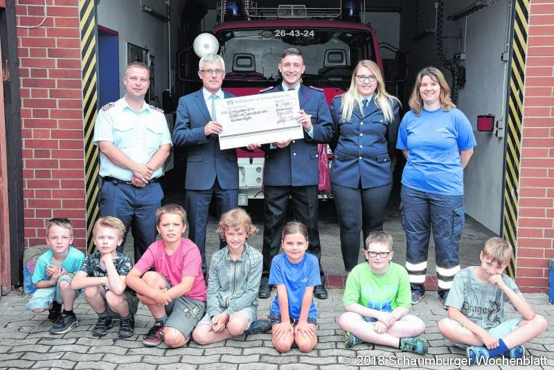 KRANKENHAGEN (ste). Jugendarbeit in der Feuerwehr ist mit viel Aufwand und Zeit verbunden. Die Kinder und Jugendlichen müssen bei Laune gehalten werden, um später als Aktive in die Wehr zu kommen. Neben dem persönlichen Engagement der Betreuer braucht man auch Geld, um die vielen Aktionen wie Zeltlager oder Freizeitangebote durchführen zu können. Dabei half jetzt die Volksbank in Schaumburg, die bei der Eröffnung der neuen Volksbank-Geschäftsstelle in Krankenhagen durch den Verkauf von Würtchen und Getränken einen stattlichen Betrag sammelte. Der wurde dann noch einmal großzügig auf 1.000 Euro aufgestockt und das Geld wurde jetzt von Bankstellenleiter Rainer Nagel an Mareike Schlüter von der Kinderfeuerwehr und Celina Rau und Christian Wessel von der Jugendfeuerwehr übergeben: "Ganz besonders die Förderung von Kindern und Jugendlichen liegt uns am Herzen", betonte Nagel bei der Geldübergabe. Foto: ste
