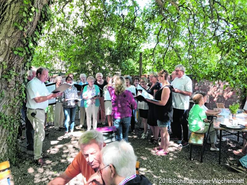 MÖLLENBECK (ste). Zum vierten Mal hieß es jetzt "Der Hofgarten singt" und zum ersten Mal in der ursprünglich geplanten Form, nämlich draußen. Der Möllenbecker Gesangverein Polyhymnia lud ein zum gemeinsamen Singen unter Bäumen des Hofgartens und alle Bänke waren besetzt. Unter über 40 Musiktiteln konnte gewählt werden, abwechselnd mit Auftritten des MGV Polyhymnia wurden eifrig gemeinsam gesungene Lieder nominiert - vom Volkslied bis zum Schlager war alles dabei. Die musikalische Begleitung erfolgte wie gewohnt durch Kasimir Tarnowski mal mit dem Schifferklavier und mal elektronisch. Durch die Veranstaltung führte routiniert der Vorsitzende des MGV, Rainer Brückner. Ein Höhepunkt war sicher der Auftritt der Chorleiterin und Mezzosopranistin Nataly Olthoff. Als sie sang, konnte man die sprichwörtliche Stecknadel zu Boden fallen hören. Wer nun Lust auf mehr Singen bekommen hat ist herzlich eingeladen, nach der Sommerpause ab dem 14. August um 19.30 Uhr bei den wöchentlichen Proben des MGV im Kloster vorbeizuschauen. Foto: privat