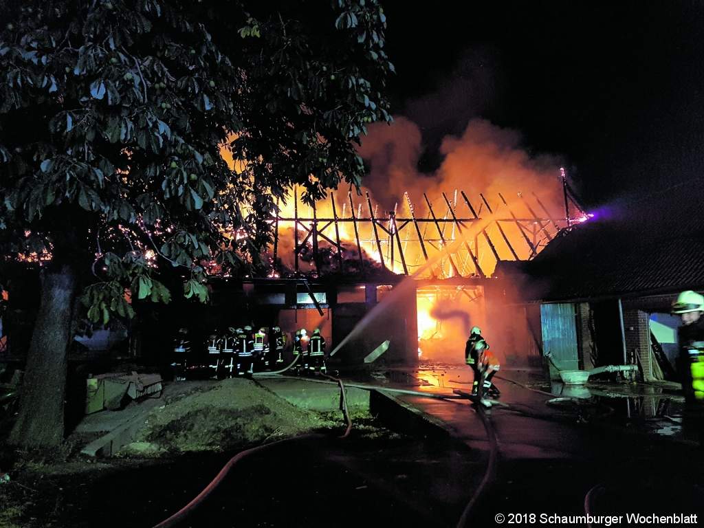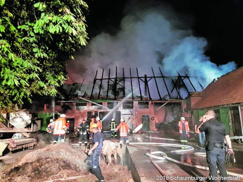 KOHLENSTÄDT (ste). Es ist Donnerstagabend gegen 22.30 Uhr, da wird der Rintelner Polizei der Vollbrand eines Bauernhofes in Kohlenstädt gemeldet. Die Feuerwehr ist da bereits auf dem Anmarsch. Das Szenario ist erschreckend. Eine hohe Rauchsäule und ein weiter Feuerschein sind schon auf der Anfahrt zu sehen. Der Bauernhof wird für Viehhaltung von Kühen und Schweinen genutzt. 50 Rinder und 40 Schweine sollen sich in den Stallungen aufhalten. Für rund 150 Feuerwehrleute aus Rinteln, Bückeburg, Hameln und von der Werkfeuerwehr Lebenshilfe sind die Löscharbeiten bei immer noch fast 30 Grad Lufttemperatur eine gefährliche und schweißtreibende Angelegenheit und das Feuer greift schnell vom möglichen Brandausbruchsort im Stall auch auf das Wohngebäude über. Durch Nachbarn, die in großer Zahl nach Bekanntwerden des Brandes zur Hilfe eilen, wird eine Person aus dem Wohnhaus evakuiert. Nach bisherigen Erkenntnissen könnte eine Strohfördermaschine als Ursache für den Brand gelten. Dort hatte der Landwirt kurz nach dem Ausbruch des Feuers die größte Feuerentwicklung festgestellt. Zwei Rinder verenden durch das Feuer, die restlichen Tiere können gerettet werden. Die Bewohner des Gebäudes bleiben zum Glück unverletzt. Die Stallungen und das Wohnhaus brennen vollständig aus. Die Polizei ermittelt jetzt am Brandort die Ursache. Foto: privat
