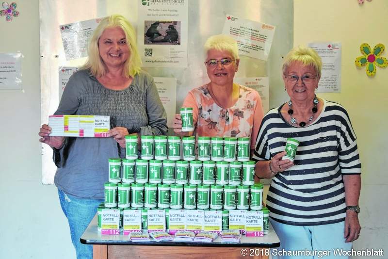 RINTELN (ste). 100 Notfalldosen konnten jetzt Irmtraud Exner und Cornelia Budde als ehrenmatliche Mitarbeiterinnen der Stadt Rinteln Heidi Niemeyer als Koordinatorin der Rintelner Tafel übergeben. Gespendet wurden die Notfalldosen von der Firma "riha-WeserGold". Die kleinen Kunststoff Dosen sind mit einem Notfallzettel zum Ausfüllen eventueller vorhergehender Erkrankungen, Medikamenteneinnahme und persönlichen Daten versehen. Dazu gehören zwei Aufkleber, von denen einer an die Innenseite der Wohnungseingangstür und der andere an die Kühlschranktür gehört. Desweiteren gibt es dazu eine Notfallkarte zum Ausfüllen für die Geldbörse. Verteilt werden die gespendeten Notfalldosen an die älteren Kunden der Tafel, für die mittwochs immer einen Extra-Ausgabetag stattfindet. Wer nicht zu den Tafelkunden gehört und gerne eine Notfalldose erwerben möchte, kann dies zum Selbstkostenpreis von zwei Euro im Bürgerbüro der Stadt Rinteln.Foto: ste