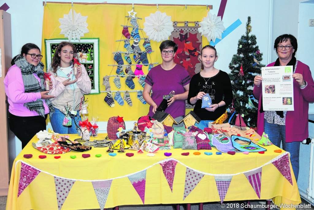 Lernwerkstatt Textil und Wahlpflichtkurs mit zahlreichen Näh- und Bastelaktion RINTELN (ste). Bereits zum dritten Mal veranstaltet Birgit Kaiser-Steding als zuständige Lehrkraft für textiles Gestalten mit ihren Schülerinnen und Schülern der Hildbugschule Rinteln die Adventskalendertombola. Seit Wochen wird sowohl im Wahlpflichtkurs der Klasse zehn aus der Oberstufe als auch von den Schülern der Klassen sieben und acht aus der Lernwerkstatt Textil der IGS genäht und gebastelt. Dazu sammelten die Schülerinnen und Schüler bei den Geschäften in und um Rinteln Gutscheine zur Füllung der Adventskalender. Drei Adventskalender, prall gefüllt mit Gutscheinen und Süßigkeiten, sind so entstanden, die in die Verlosung gehen. Weitere 150 Gewinne wie Selbstgenähtes, Weihnachtsdekoration, Kulinarisches und Windlichter werden in der Verlosung sein. Los geht es am 1. Dezember ab zehn Uhr im Mehrgenerationenhaus auf dem Adventszauber. Dann sind die Lose, von denen jedes zweite gewinnt, für 1,50 Euro (drei Lose für vier Euro) bei den Schülern erhältlich. Die Nieten nehmen dann an der Verlosung der Adventskalender teil. Die Ziehung der drei Hauptgewinner findet dann um 17 Uhr am Mehrgenerationenhaus statt. Der Erlös der gesamten Aktion soll der Rintelner Silvesterinitiative zugute kommen.