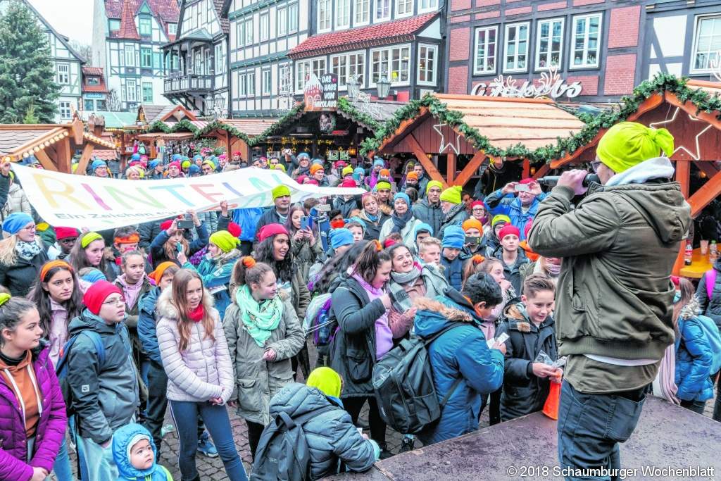 RINTELN (ste). Die Idee zu einem Flashmob im Herzen Rintelns, dem Marktplatz, ist bereits im Mai und August des Jahres aus dem Bündnis "Integration im Miteinander Rinteln" entstanden, um Vielfalt sichtbar zu machen. Das Bündnis ist eine Zusammenarbeit mit dem Bundesprogramm "Willkommen bei Freunden, Bündnis für junge Flüchtlinge", um die Integration zu stärken. Die Idee eines Flashmobs entstand in Zusammenarbeit der Integrationsbeauftragten Juliane Rohlfing mit Mitarbeitern der Stadtverwaltung, dem Familienzentrum und dem Bündnispartner dem DRK KV Schaumburg. Damit das Motto "Rinteln ist bunt" auch umgesetzt werden konnte, wurden bunte Mützen getragen, damit es aus der Vogelperspektive ein buntes Bild ergibt. Foto: ste