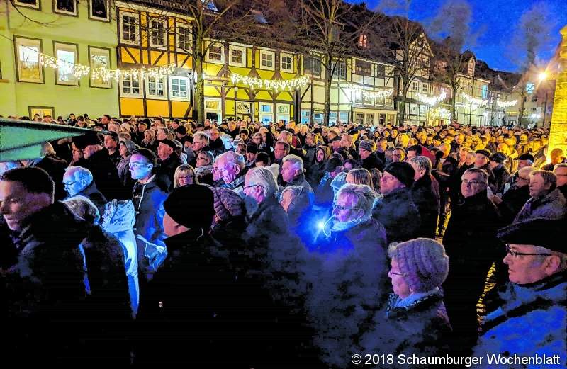 RINTELN (km). Kaum noch Stehplätze gab es am Heiligabend bei der Christmette der Nikolai-Gemeinde auf dem Kirchplatz: Über 500 Besucher waren bei dem Gottesdienst unter der Leitung von Superintendent Andreas Kühne-Glaser mit von der Partie. Auch Petrus hatte ein Einsehen: Während es den ganzen Tag lang überwiegend geregnet hatte, blieb es während der Veranstaltung am späten Nachmittag weitgehend trocken. Insgesamt hatte die Nikolai-Gemeinde allein am Heiligabend zu fünf Gottesdiensten eingeladen. Bei den Christvespern um 15 und 16 Uhr hatten die Konfirmanden der Gemeinde ein Krippenspiel aufgeführt. "Engel" mit Lichtern erwarteten die Gottesdienstbesucher schon am Eingang. Die Leitung hatte Pastorin Sabine Schiermeyer. Auf dem Kirchplatz sorgte um 17 Uhr ein Bläserkreis unter der Leitung von Christian Kornmaul für die passende musikalische Begleitung. Um 18 Uhr wanderte das Geschehen zur dritten Christvesper, ebenfalls mit Andreas Kühne-Glaser, dann wieder in die Kirche. Und um 23 Uhr schließlich hatte die Gemeinde zur stimmungsvollen Christmette mit Sabine Schiermeyer und dem Jugendchor unter der Leitung von Kantorin Daniela Brinkmann eingeladen. Zum musikalischen Finale erklangen gegen Mitternacht Trompeten- und Posaunenklängen vom Kirchturm. Foto: km