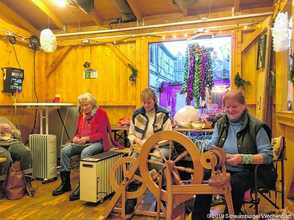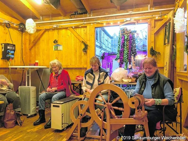 RINTELN (ste). Ganz schön am Rad gedreht haben die Rintelner NABU-Aktiven im Mehrgenerationenhäuschen: Ein halbes Dutzend Frauen der NABU-eigenen Spinngruppe um Britta Raabe hat sich in der adventlichen Fußgängerzone getroffen, um in gemütlicher Runde Wolle zu verspinnen und nebenbei einen lebendigen Einblick in das alte Handwerk des Spinnens zu geben. So gaben auch Marianne Albrecht und Lydia Welker-Schwab gerne Auskunft und überließen auch interessierte Besucher selbst das Spinnrad, wenn diese sich trauten. "Ganz so schwer ist es eigentlich nicht und Übung macht den Meister", wie Albrecht weiß. Der Hintergrund dieser Aktivitäten wird auch schnell deutlich. Da die Skudden regelmäßig geschoren werden müssen, fällt allerhand Wolle an, die verarbeitet werden will. So kommt die Belebung eines alten Handwerks neben der Produktion des Naturprodukts Wolle auch dem Naturschutz in Form der Biotoppflege zugute. Foto: privat