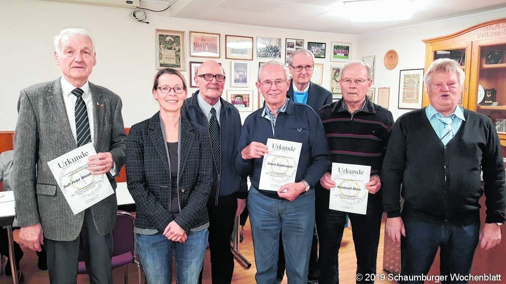 VOLKSEN (ste). So richtig Freude aufkommen wollte auf der Jahreshauptversammlung des MGV "Germania Volksen-Friedrichshöhe" nicht, denn nach schwerer Krankheit verstarb wenige Tage vor der Versammlung der erste Vorsitzende Bernhard "Berni" Pullner. Seine Stellvertreterin Heike Brenner übernimmt ein schweres Erbe, denn auch der Tod von Karl Meier aus dem 1. Tenor riss eine Lücke in den Verein und die Stimmen für eine Auflösung des Vereins waren laut und deutlich zu hören. Doch Heike Brenner ist keine Frau, die den Kopf in den Sand steckt. Sie will mit hoher Motivation und viel Spaß dem Verein wieder neuen Schwung geben: "Eigentlich wollte man ja meinen Mann für den Gesang werben und nahm dann doch mit mir Vorlieb", scherzte sie in ihrem Jahresrückblick für die Presse und auch sonst merkt man der Frau Durchsetzungsvermögen und Humor an. Beides braucht sie für "Ihre" Männer und helfen soll ihr dabei Karl-Heinz Kampmeier, der nach der Wahl von Brenner als Vorsitzende den zweiten Vorsitz behält. Und so absolvierte Heike Brenner nicht nur die Versammlung mit ihren Ehrungen für die Fördermitglieder Geoffrey Seaman (45 Jahre), Ralf-Peter Wunderlich (40 Jahre) und Gerhard Wolter (30 Jahre) sowie für Erwin Baukrowitz (30 Jahre) und Reinhard Marx (45 Jahre) als aktive Sänger mit Bravour, sondern zeigte auch beim Haxenessen "Stehvermögen". Ein "sprachlicher Genuss" war wieder einmal die Jahreschronik von Harry Paulinski und sängerisch soll es in diesem Jahr erst einmal zweistimmig weitergehen, bis sich neue Sänger von dem Virus "Gesang" anstecken lassen und man hoffentlich gestärkt in die Zukunft geht. Heike Brenner versprach, sich dafür einzusetzen. Foto: ste