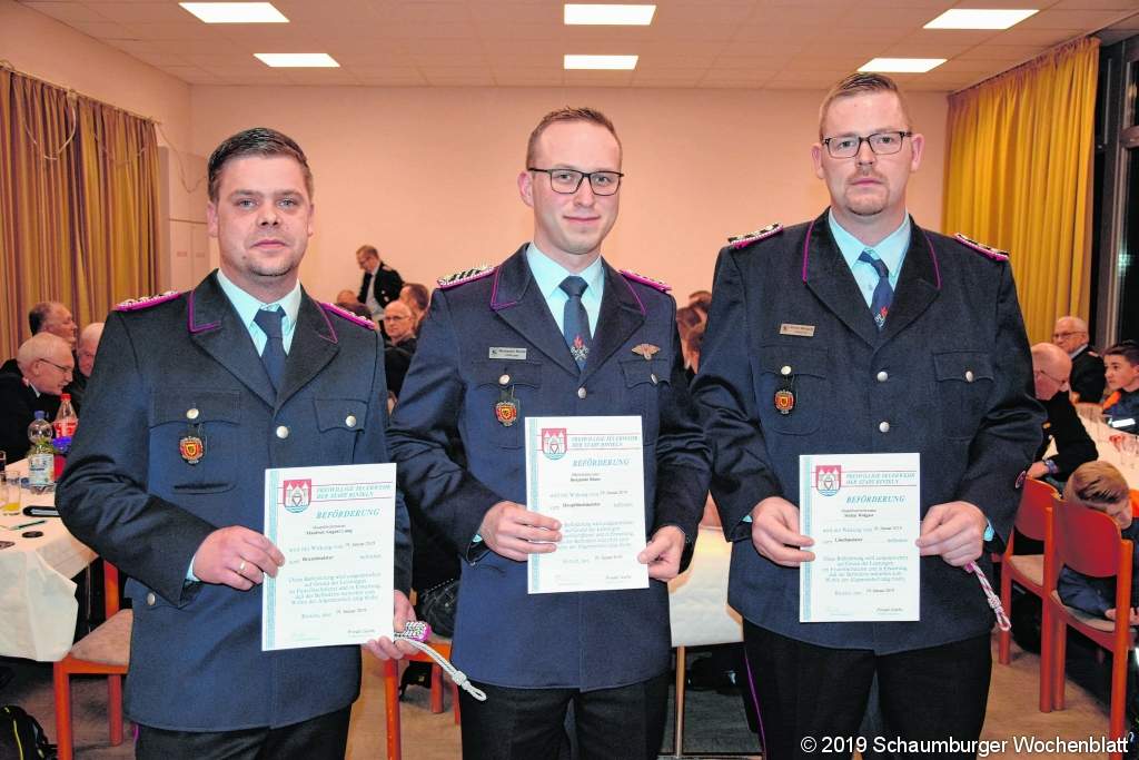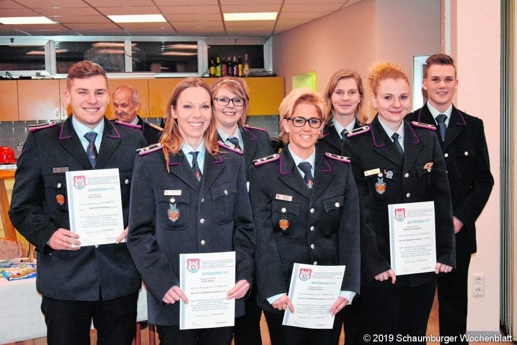 EXTEN (ste). Stefan Eggert-Edeler leitet das Bauamt der Stadt Rinteln und er stellte sich auf der Jahresversammlung der Ortswehr selbst die Frage: "Was treibt eigentlich Kinder und Jugendliche in die Jugendabteilungen der Feuerwehren?" Und er fand für sich auch die Antwort: "Bei manchen gibt es erbliche Vorbelastungen, andere sind begeistert von der Technik und viele wollen auch Verantwortung übernehmen, in der Gemeinschaft Spaß haben, Erfahrungen sammeln!" Und das sei auch gut so, lobte er die Arbeit in der Kinder- und Jugendwehr, denn Gewinner dieser richtigen Entscheidung der jungen Menschen seien nicht nur die Feuerwehren: "Auch die Gesellschaft an sich und natürlich die Kinder und Jugendlichen profitieren von dieser perfekten Gemeinschaft!" Für die Aktiven in der Einsatzabteilung stiegen im Laufe der Jahre die Gefahren immer mehr: "Da dürfen Feuerwehrleute nicht auf dem Schlauch stehen!" Die gute Ausbildung, die technische Ausrüstung der Wehren und die hohe Motivation der Einsatzkräfte sorge dafür, dass das auch nicht passiere. Eine Extener Besonderheit hob Ortsbürgermeister Bernd Kirchhoff hervor: "Wir haben schon lange eine starke Frauentruppe mit 14 Mädchen in der Kinderfeuerwehr, sechs in der Jugendfeuerwehr und 14 Frauen bei den Aktiven!" Das sei "Spitze"! Auf wen die Wehren heute zählen könnten, stellte Friedel Garbe heraus: "Auf den Nachwuchs aus den Jugendwehren!" Seiteneinsteiger seien Mangelware. Von 32 in der Truppmannausbildung seien 29 aus den Jugendwehren. Dabei brauchen die Wehren dringend Nachwuchs, um die Einsätze (32 in Exten) bewältigen zu können. Neun Minuten ist die gesetzte Hilfsfrist im Ort und die konnten weitgehend auch zur Tageszeit eingehalten werden. In diesem Jahr wartet die Wehr auf ihr neues Tanklöschfahrzeug. Mit den Ortswehren Hohenrode und Strücken bildet die Stützpunktwehr Exten einen Brandschutzabschnitt und will die Zusammenarbeit weiter verbessern. Über ihre Beförderung freuten sich dann Julia Kirstein, Marco Kirstein, Katharina Schumacher, Stephanie Riedel, Katja Rippel, Falk Giese, Stefan Wolgast, Ortsbrandmeister Benjamin Bünte sein Stellvertreter Manfred Lang. Geehrt wurden Christian Voß (25), Stefan Wolgast (25), Stephan Wedler (40) und Oliver Kirstein (40). Foto: ste