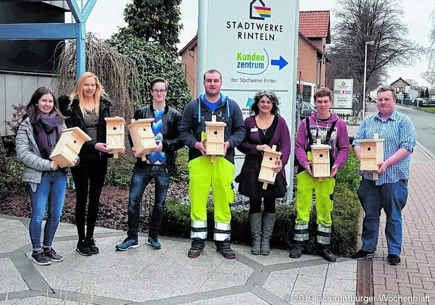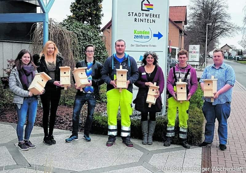 RINTELN (ste). In Kooperation mit dem NABU erstellten Azubis der Rintelner Stadtwerke jetzt Nisthilfen für heimische Singvögel. Die sechs Auszubildende aus dem technischen und kaufmännischen Bereich hatten sich zuvor bei Britta Raabe darüber informiert, welche heimische Singvogelarten es gibt und sie lernten auch die Möglichkeiten der Vogelbestimmung kennen. Getreu dem Motto "Vom Wissen zum Handeln" machten sie sich dann daran, insgesamt 20 Nisthilfen für Blau- und Kohlmeisen anzufertigen. Der Großteil davon wird zur nistökologischen Aufwertung der Außenanlagen der Stadtwerke Rinteln sowie des Betriebshofes führen: Pünktlich vor Brutbeginn werden die Nisthilfen von den Mitarbeiterinnen und Mitarbeitern der Stadtwerke aufgehängt und jeder der Azubis durfte auch einen Nistkasten mit nach Hause nehmen. Die Auszubildenden sollen sich später auch um die Kontrolle und Reparatur der Nisthilfen kümmern. Foto: privat