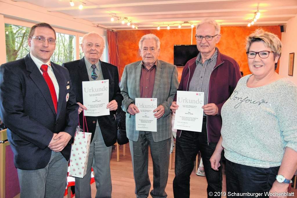 RINTELN (ste). Wenn die orangeroten Helferjacken des DRK im Anmarsch sind, dann naht Hilfe zu fast jeder Gelegenheit. Hilfe, die auch von der Stadt Rinteln gerne angenommen wird, wie Ortsbürgermeister Kay Steding betonte und dafür dankte, dass das DRK auf vielen städtischen Veranstaltungen mit seiner Bereitschaft präsent ist. Und er hatte neben dem obligatorischen Briefumschlag auch noch eine Bitte mitgebracht: "Bei der Seniorenfahrt auf der Weser bräuchten wir ihre Hilfe!" Wie vielfältig das DRK auch im Kreis aufgestellt ist, das konnte man von Bernd Koller hören. Aus dem Blaulichttag in Rinteln habe man gelernt, wie gut die Hilfsorganisationen zusammenarbeiten und deshalb engagiere sich das DRK künftig auch bei Hochwassereinsätzen. Stolz war Koller auf die gelungene Werbeaktion für Mitgliedschaften im DRK. Dadurch sei der Kreisverband auf 5.600 Mitglieder gewachsen. Und Koller hatte noch ein paar Zahlen mitgebracht. Der fleißigste Blutspender im Kreis kommt aus Haste und hat bereits 213 Mal Blut gespendet, 690 Anträge gibt es beim Hausnotruf und die Mitarbeiterzahl im Kreisverband sei auf 250 gestiegen. 40.000 Euro konnte der Kreisverband für die Tafeln aus den Erlösen aus den Kleidersammlungen aufbringen und Rinteln habe im Kreisverband die zweitgrößte Tafel. Für Matthias Voges als Vorsitzender des Ortsvereins waren aber auch die Zahlen und Fakten aus dem eigenen Bereich wichtig. 1.123 Spender ließen ihr Blut bei fünf großen Blutspenden in der BBS und fünf Sonderblutspenden, darunter auch ein Spender, der schon 170 Mal spendete. 105 Erst-Blutspender gab es und das Blutspendeteam funktioniert prächtig. Die zehn Aktiven in der Bereitschaft leistete 900 Dienststunden, vorrangig in Rinteln, aber auch beim Open-Air Festival in Wacken. Aus dem Jugendrotkreuz berichtete das Betreuerteam von vielen Aktionen und einem Kind, das Feuer und Flamme für den Bereitschaftsdienst ist. Immer wieder nutzt man im JRK die Gelegenheit, um sich und seine Arbeit zu präsentieren und mehr Kinder und Jugendliche dazu zu gewinnen, mitzumachen bei der Jugendorganisation des DRK. Eine ganz besonders schöne Pflicht hatte Matthias Voges dann noch, als er die Langjährigen ehren durfte. 25 Jahre dabei sind Heinrich Beilke, Rolf Tünnermann und Johann Jungnitz. 21 weitere Jubilare konnten leider nicht an der Versammlung teilnehmen.Foto: ste