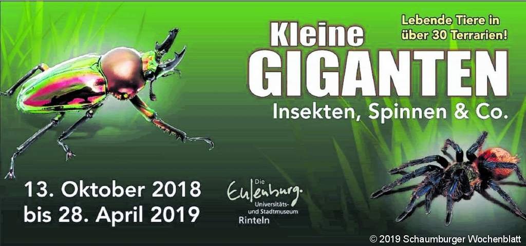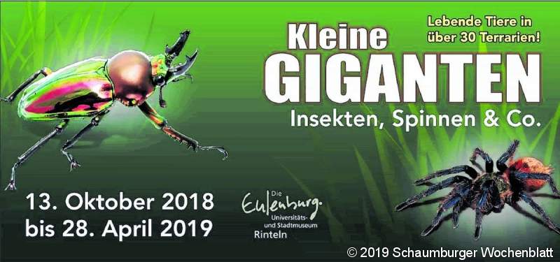 RINTELN (km). Der Heimatbund Grafschaft Schaumburg hat jetzt seine Termine für den April bekannt gegeben. Zum Auftakt gibt es wieder eine Wanderung. Am Donnerstag, dem vierten April, geht es in Todenmann über den Kirschblütenweg - mit anschließender Einkehr zum Kaffeetrinken im Café Waltraud. Treffpunkt ist um 13.30 Uhr auf dem Parkplatz am Steinanger. Die Freunde der plattdeutschen Sprache treffen sich das nächste Mal am Donnerstag, dem elften April. Treffpunkt ist wie immer um 15 Uhr im Hotel "Stadt Kassel". Ansprechpartner sind Gerd Wilkening (Telefon 05751/75266) und Heinrich Edler (05751/2488). Die Sonderausstellung "Kleine Giganten. Insekten, Spinnen & Co" ist noch bis zum 28. April zu sehen. In über 30 Terrarien finden die Besucher diverse Käfer, Spinnen, Ameisen oder auch exotische Insekten in einer lebensechten Umgebung. Sitzgelegenheiten laden dazu ein, sich Zeit zu nehmen und auf die faszinierenden Tiere mit ihren erstaunlichen Fähigkeiten einzulassen. Mikroskopiertische mit vorbereiteten Präparaten und großformatige Bilder machen zusätzliche detaillierte Einblicke möglich. Modelle, Filme und Schaukästen mit Schmetterlingen, Käfern und Heuschrecken runden die außergewöhnliche Ausstellung ab. Die Eulenburg, das Universitäts- und Stadtmuseum Rinteln, ist geöffnet dienstags bis Samstags von 14 bis 17 Uhr sowie sonn- und feiertags von 11 bis 17 Uhr. Für Gruppen sind nach Absprache auch Termine vormittags oder abends möglich (Telefon 05751/ 41197).