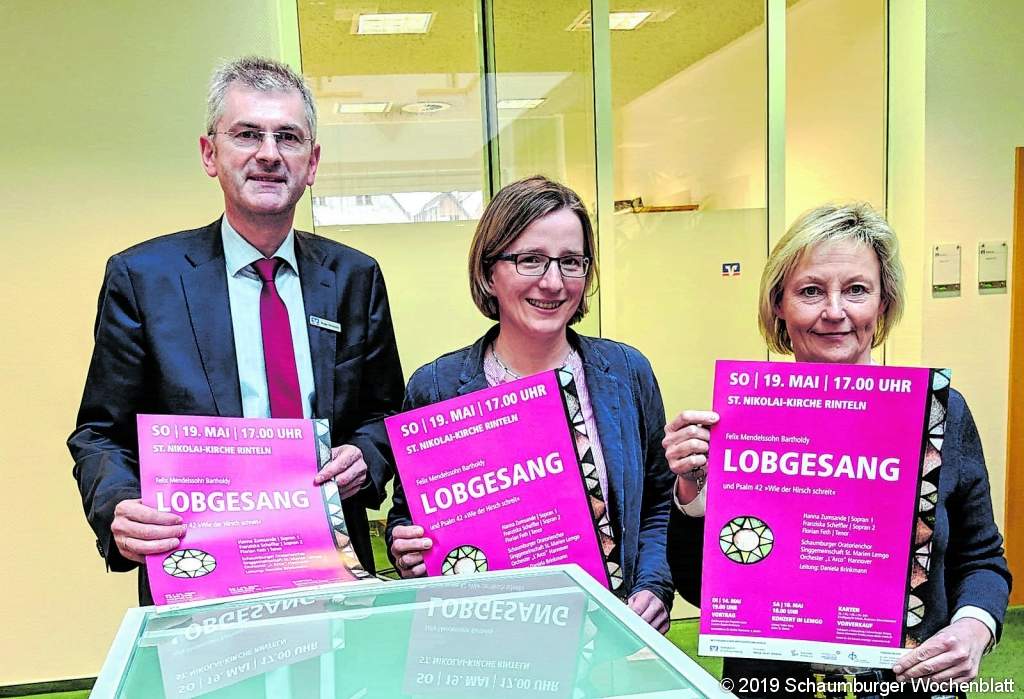 RINTELN (km). "Alles, was Odem hat, lobe den Herrn" - unter diesem Motto steht ein großes Chor- und Orchesterkonzert, das am "Kantate-Sonntag", dem 19. Mai, ab 17 Uhr in der Nikolai-Kirche zu hören sein wird. Auf dem Programm stehen mit dem "Lobgesang" und dem 42. Psalm "Wie der Hirsch schreit" zwei Werke von Felix Mendelssohn-Bartholdy, die Kreiskantorin Daniela Brinkmann jetzt beim Hauptsponsor, der Volksbank, vorstellte. Der Kartenvorverkauf beginnt am morgigen Donnerstag, dem zehnten April. Für die Aufführung finden sich zwei Chöre zusammen: Der Schaumburger Oratorienchor und die Singgemeinschaft Sankt Marien aus Lemgo unter der Leitung von Kantor Volker Jänig setzen ihre erfolgreiche Zusammenarbeit fort, die vor zwei Jahren mit einem Weihnachtsprogramm begonnen wurde. Gemeinsam mit den Solisten Hanna Zumsande, Franziska Scheffler (beide Sopran), Florian Feth (Tenor) und dem Orchester L'Arco aus Hannover musizieren insgesamt rund 150 Mitwirkende unter der Leitung von Kirchenkreiskantorin Daniela Brinkmann. Felix Mendelssohn Bartholdy komponierte den "Lobgesang" opus 52 anlässlich eines Festes der Stadt Leipzig im Jahre 1840, das die Erfindung des Buchdrucks durch Johannes Gutenberg - 400 Jahre zuvor - feierte. Der Lobgesang wurde auch als Mendelssohns "2. Sinfonie" bekannt. "Das Werk," erläuterte Daniela Brinkmann, "beginnt mit einem sinfonischen Teil, dessen drei Sätze nahtlos ineinander übergehen. Erst danach kommen Solisten und Chor dazu und musizieren in nochmals neun Sätzen mit dem Orchester zusammen." Inhaltlich vertonte Mendelssohn Bibelzitate, die das Lob Gottes in den Mittelpunkt stellen. An zentraler Stelle steht der bekannte Choral "Nun danket alle Gott". Die Aufführung erfordert ein großes romantisches Orchester mit Holz- und Blechbläsern, Pauken und Streichern. Eröffnet wird das etwa 90-minütige Konzert mit Mendelssohns Vertonung des 42. Psalms "Wie der Hirsch schreit". Karten sind ab dem morgigen Donnerstag, dem zehnten April bei der Volksbank in Schaumburg, bei der Schaumburger Zeitung, bei der Tourist-Info Rinteln oder online unter "www.nikolai-rinteln.de" erhältlich. Die Tickets kosten zehn bis 25 Euro - für Schüler, Studenten und Schwerbehinderte gibt es eine Ermäßigung. Eine Einführung in das Programm findet am Dienstag, dem 14. Mai, um 19 Uhr im Nikolai- Gemeindehaus an der Ostertorstraße statt. Kantorin Daniela Brinkmann wird in einem rund einstündigen Vortrag mit Klangbeispielen die Werke vorstellen und Informationen zu ihrer Entstehung geben. Die Teilnahme ist kostenlos. Bereits am Samstag, dem 18. Mai, erklingt das gleiche Programm mit beiden Chören um 18 Uhr in der Marien-Kirche in Lemgo. Die Leitung dabei hat der Lemgoer Kantor Volker Jänig. - Das Konzert wird gefördert durch die Volksbank in Schaumburg, den Förderkreis "Musik an St. Nikolai", den Kirchenkreis Grafschaft Schaumburg, die Landeskirche Hannovers und den Kulturring Rinteln e.V.. Foto: km