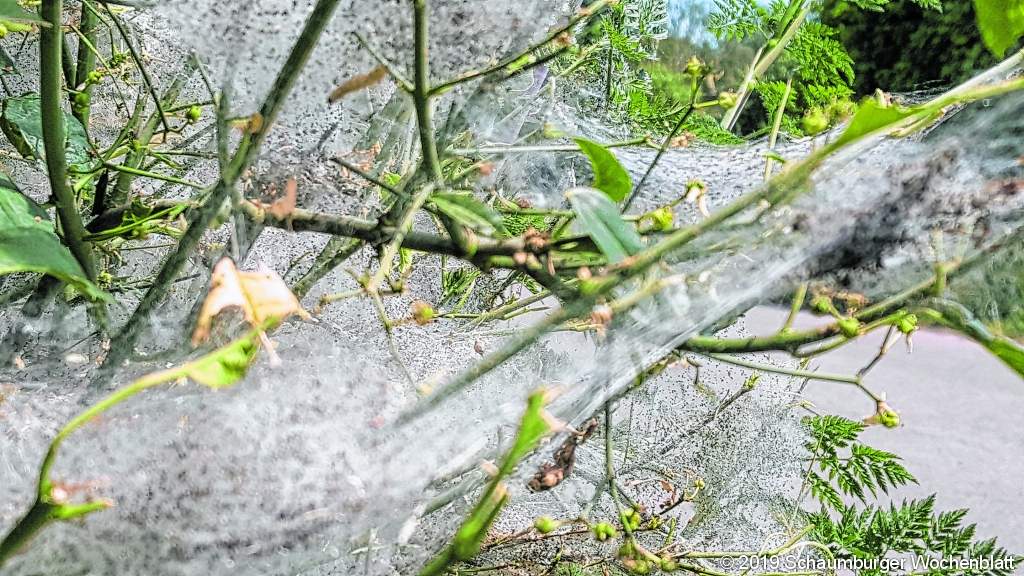 RINTELN (ste). Würde man die Gespinstmotte fragen, was sie vom Klimawandel hält, wäre sie wahrscheinlich begeistert. Die steigenden Temperaturen und die Trockenheit begünstigt die Population dieser Schmetterlingsart. In Rinteln kann man derzeit viele dieser ganz Büsche erfassenden Nester der Gespinst- oder Knospenmotten finden, gefährlich sind sie übrigens nicht. Denn auch wenn die gefrässigen Tiere die Blätter an den Büschen ordentlich abknabbern, wachsen die nach, wenn die Motten ausschwärmen; der Busch erholt sich. Anders sieht das bei einigen Unterarten wie der Apfelbaumgespinstmotte aus, die Obst- und Gartengehöle schädigen können und die von Kleingärtnern bekämpft werden. Das geht oft mechanisch durch das gefahrlose Entfernen der Nester, denn anders als der Eichenprozessionsspinner mit seinen Brennhaaren gibt es bei den Gespinstmotten keine allergischen Reaktionen bei Berührung. Warum die Mottenart übrigens so große und aufwendige Netze spinnt, darüber diskutiert man in der Wissenschaft noch. Eine Erklärung: Die Larven sollen vor gefrässigen Vögeln geschützt werden. Foto: ste
