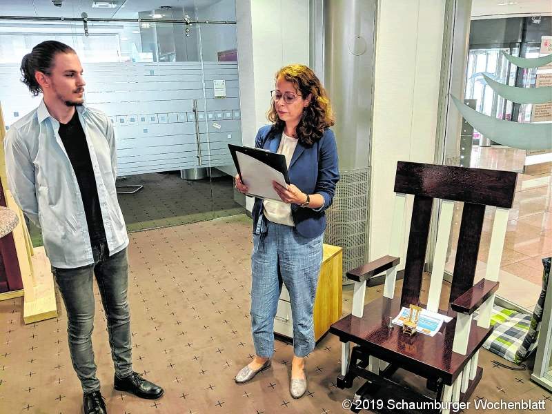 RINTELN (km). Noch bis Donnerstag, dem 13. Juni, gibt es in der Kundenhalle der Sparkasse an der Klosterstraße eine Ausstellung der Tischlerinnung Schaumburg, bei der die Prüfungswerke von zehn angehenden Gesellen zu bewundern sind. Bei der mit Live-Musik umrahmten Eröffnung hatten sich am Mittwoch bereits zahlreiche Interessenten eingefunden, um die vielfältigen Objekte unter die Lupe zu nehmen. Im Angebot waren neben den klassischen Arbeiten auch einige eher ungewöhnliche Stücke, zum Beispiel ein origineller Schaukelstuhl. Zu den fachkundigen Rednern zählten Rüdiger Altfeld, Obermeister der Tischler-Innung Schaumburg, Niels Hogendoorn, Fachlehrer bei den berufsbildenden Schulen (BBS), Claudia Klemm vom Verband des Tischlerhandwerks Niedersachsen/Bremen, Dirk Ackmann als Repräsentant der Sparkasse sowie die stellvertretende Landrätin Helma Hartmann-Grolm. Aus den Erläuterungen der Experten ging hervor, dass die Auszubildenden überwiegend heimische Holzarten verarbeitet hatten. Alle Gesellenstücke wurden innerhalb von wenigen Wochen nach eigener Gestaltung und Zeichnung gefertigt. Während die Kandidaten ihre schriftliche Prüfung bereits in der vergangenen Woche abgelegt hatten, müssen sie jetzt noch eine siebenstündige Arbeitsprobe in der Holzwerkstatt der BBS durchführen. Der traditionell parallel inszenierte Wettbewerb unter dem Titel "Die gute Form" fand auch diesmal außerhalb der Gesellen-Prüfung statt. Dabei begutachtete eine Fachjury die Exponate unter den Gesichtspunkten Originalität, Gestaltungsqualität und Funktionalität: Claudia Klemm vom Tischler-Landesverband, der Architekt und Designer Siegert Beck sowie Dirk Ackmann als fachlich interessierter Laie. Danach belegte Daniel Stephan (Heinrich Matthias Tischlerei und Bestattungen GmbH) mit seinem Objekt "Tradition" aus moderner Esche mit Hartwachs den ersten Platz. Zweiter wurde Florian Brosig (Gausmann, Obernkirchen) mit seinem originellen Schaukelstuhl "Kunibert" (Eiche gebeizt und lackiert) vor Julian Schulze-Neick (Schaumburger Beschäftigungs GmbH), der für seine "Tischlerschatzkiste", in Ahorn und Nussbaum geölt, mit dem dritten Preis belohnt wurde. Bis zum kommenden Donnerstag, dem 13. Juni, findet die Wahl des Publikumspreises statt. Die Besucher der Ausstellung können ihr Votum für die drei besten Gesellenstücke abgeben. Die Gewinner bekommen dann am folgenden Freitag, 13 Uhr jeweils einen Preis überreicht. Die Sachpreise werden von der Sparkasse zur Verfügung gestellt.Foto: km