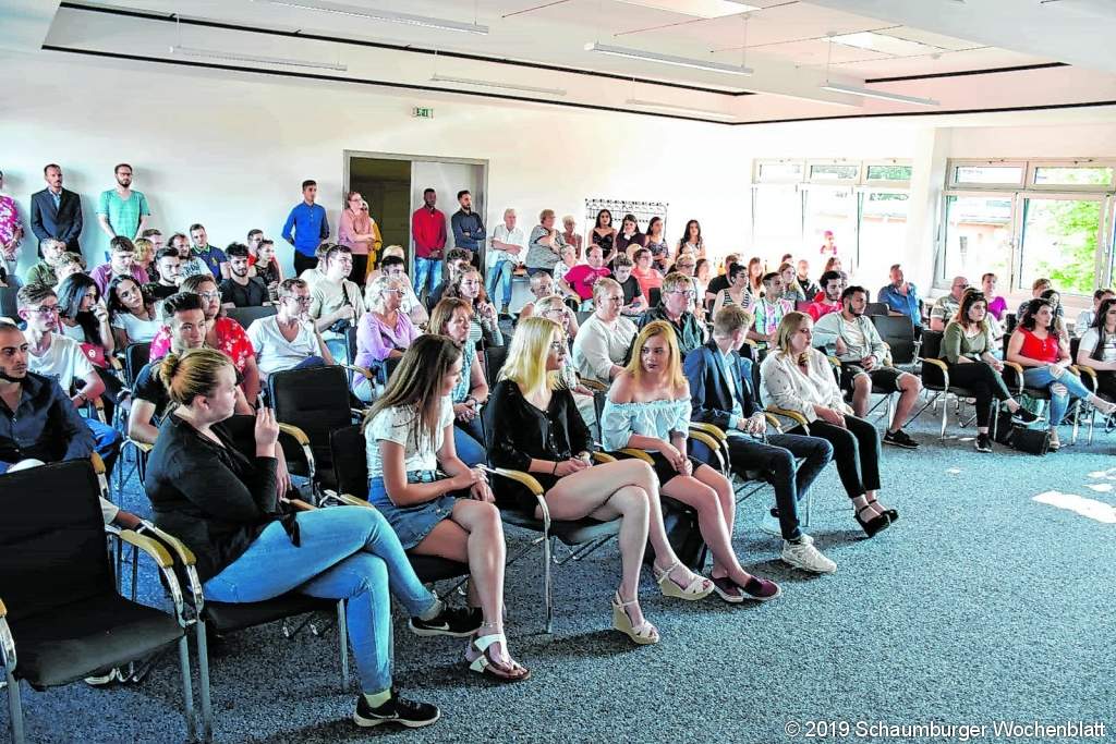 RINTELN (km). Im Rahmen einer feierlichen Zeremonie bekamen jetzt 67 Schülerinnen und Schüler ihre auf dem zweiten Bildungsweg erworbenen Abschluss-Zeugnisse überreicht. Im Rathaussaal konnte Projektleiterin Bernadette Unger-Knippschild von der Volkshochschule alle frischgebackenen Absolventen von Haupt- und Realschule begrüßen. 19 Hauptschulabschlüsse, 33 Realschulabschlüsse sowie 15 erweiterte Realschulabschlüsse, die zum Besuch des beruflichen Gymnasiums qualifizieren, hatte die Landesschulbehörde in Rinteln vergeben. Die Absolventen waren in einem elfmonatigen Vorbereitungslehrgang bei der VHS Schaumburg (Stadthagen und Rinteln) auf die Prüfungen vorbereitet worden. Insgesamt gab es in Rinteln zwei Realschulgruppen, in Stadthagen jeweils eine Haupt- und eine Realschulgruppe sowie ein Kombilehrgang (Haupt-und Realschüler) für Geflüchtete. Der Kombilehrgang wurde aus Landesmittel des Ministeriums finanziert. Die besten Hauptschulabschlüsse der jeweiligen Kurse erlangten Elalie Akoumia (1,33), Hauptschul-Kombilehrgang für Geflüchtete)sowie Simon Böker (1,5), Hauptschule Stadthagen. Für die besten Realschulabschlüsse wurden Leah Depping (1,63), sowie Sammy Menasria (1,75), beide Realschule Rinteln ausgezeichnet. Insgesamt wurden 14 der 67 Teilnehmer für ihre guten Leistungen belobigt. In der Prüfungsphase hatten die von der Landesschulbehörde beauftragten Dozentinnen und Dozenten 887 schriftliche Arbeiten korrigiert und 359 mündliche Prüfungen abgenommen. Jede Arbeit musste jeweils von zwei Prüfern korrigiert werden, ebenso wie die mündlichen Prüfungen. Die Abschlüsse sind den an allgemeinbildenden Schulen formal gleich gestellt und eröffnen den Absolventen auch die gleichen Möglichkeiten. Foto: km