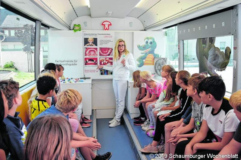 RINTELN (ste). Mit dem "Krocky"-Mobil, einem Informationsbus zum Thema Zahn- und Kiefergesundheit, besuchten Kieferorthopädin Dr. medic. strom. Petra Meyer und drei ihrer Zahnmedizinischer Mitarbeiterinnen die Schülerinnen und Schüler der dritten und vierten Klasse der Grundschule Nord, um für mehr Kiefergesundheit zu werben. Bei der kindgerechten Aufklärung über die verschiedenen Fehlstellungen, Zahnspangen und dem Wechselgebiss anhand von Infotafeln wurde den Schülern aufgezeigt, wie wichtig es ist, frühzeitig Zahnfehlstellungen und Kieferanomalien zu behandeln. Dann ging es unter Anleitung an das Zahneputzen, das nach dem Namen KAI (Kau-, Außen- und Innenflächen) von den jungen Schülerinnen und Schülern durchgeführt werden sollte. Nach dem Aufträufeln eines Tropfen Speisefarbe und dem Verteilen auf den Zähnen konnten die Schüler in der "Zahndisco" unter Schwarzlicht erkennen, welche Zahnstellen sie nicht richtig gereinigt haben und diese nachputzen. Sehr wissbegierig und mit viel Spaß waren die Dritt- und Viertklässler bei der Aktion dabei. Zur Freude von Dr. Petra Meyer, denn sicher ist, dass bei einer gründlichen Vorsorge und Aufklärung Kieferorthopädische Behandlungen vermieden oder kürzer und einfacher Durchgeführt werden können. Der Infobus "Krocky"-Mobil wird von der Initiative Kiefergesundheit e.V. getragen, die sich seit 1992 aus Kieferorthopäden zusammensetzt und finanziert wird. Foto: ste