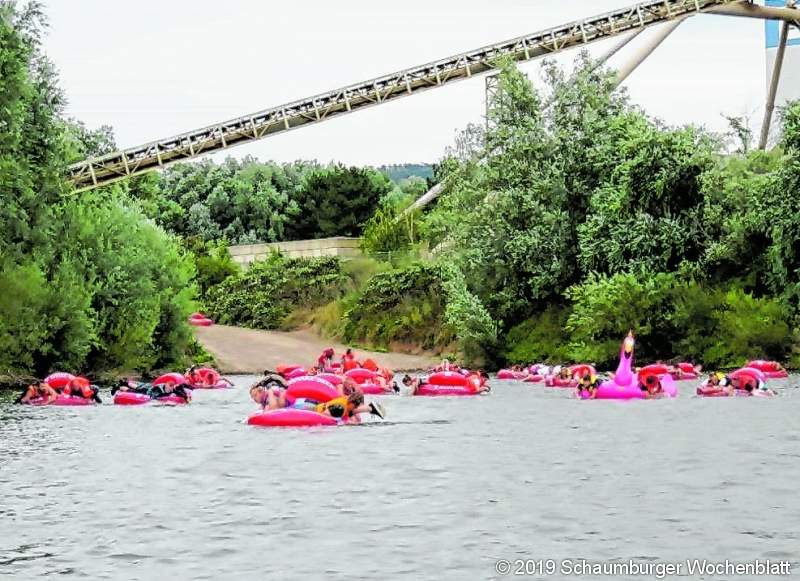 RINTELN (ste). Mittendrin im Pulk der 35 Badeinseln befindet sich auch der Schreiber dieser Zeilen, zusammen mit Axel Balsmeyer auf der Insel "35". Die ist besonders fest aufgepumpt, wirkt solide und schon beim Einpaddeln auf dem Kiesteich in Ahe zeigt sich: "Das könnte was werden mit uns beiden!" Immerhin ist die Inselbesatzung erfahren beim Sieg einer Badeinselregatta, denn sowohl Axel Balsmeyer als auch Stephan Weichert hatten bereits je einmal in der Besetzung mit Doppelsieger Marius Weichert die Regatta gewonnen. Und dann gab es ja noch das Duell "Alt" gegen "Jung", denn Marius Weichert hatte in diesem Jahr eine Insel mit Henry Balsmeyer besetzt. Doch auch die Vorjahressieger Ole Perrey und Tino Bedey wollten noch vorne mitmischen, zeigten sich kampfeslustig. Auch Ivo Kirasic war mit seinem Paddelpartner überzeugt, dass Muskelkraft und Ausdauer ausreichten, um vorne mit dabei zu sein. Und dann gab es ja noch das Geheimfavoritenpaar Merlin Biastoch zusammen mit seiner Freundin Emilia Peters aus Bad Oeyhausen auf einer Insel. Merlin hatte im August bei den Deutschen Schwimmmeisterschaften in Berlin mit zwei persönlichen Bestleistungen für eine Überraschung gesorgt und auch Emilia ist eine begnadete Schwimmerin. Merlin ist in Rinteln gut bekannt als angehende Fachkraft für Bäderbetriebe im Freibad und sein durchtrainierter Körper ließ auch auf der Badeinsel erahnen, dass für diesen Fun-Wettkampf jede Menge Potential in ihm steckt. Die Spannung steigt als Arif Sanal das Startsignal gibt und die Feuerwehr- und DLRG-Boote den Weg frei machen für die knallroten Badeinseln. Am besten kommen die "Alten" auf der 35er Insel in die Strömung und setzen sich, gefolgt von 6 weiteren Inseln, einige Meter ab. Doch wie ein Motor treibt Merlin Biastoch seine Insel immer weiter nach vorne und es kommt zum Duell der beiden Haake-Beck-Inseln, das Biastoch für sich entscheiden kann. Dann der Fehler der ansonsten strömungserfahrenen Ex-Sieger auf der "35": Die Crew lässt sich zu weit an den Rand treiben und büßt wertvolle Sekunden ein. Die Verfolger, unter ihnen die "Jungen" des Familienduells, rücken auf, überholen und sezten sich ein paar Meter ab. Zurück in die Strömung paddeln, gleichmäßiges und harmonisches Eintauchen der Paddelhände in das warme Weserwasser und schon geht es wieder gut ab für die "35", jetzt auf Position 6. "Schlag, Schlag, Schlag", heißt es vom Tonangeber Axel Balsmeyer, dann wieder eine Drehung, damit man nicht einseitig belastet ist. Meter für Meter kämpft sich die "35" wieder an die Spitzengruppe heran und dann dringt ein merkwürdiges Geräusch an die Ohren des Teams: "Es zischt!" Mit dem Zischen verringert sich der Abstand zwischen Team und Weser und irgendwann wird klar: "Wir sinken!" Die Schwimmwesten sorgen für Auftrieb, das DLRG-Boot übernimmt die defekte Badeinsel und den Rest der Strecke lassen wir uns entspannt auf der Weser treiben. Im Ziel dann ein spannendes Duell zwischen den Plätzen zwei bis vier. Vorne hatten sich nämlich auf Platz 1 Emilia Peters und Merlin Biastoch klar abgesetzt und holten sich den Reisegutschein im Wert von 500 Euro vom "Reiseland Rinteln" sowie die Spende für den guten Zweck in Höhe von 600 Euro. Die Zieleinlaufregel lautete: "Badeinsel bis zum Ufer gemeinsam paddeln, dann darf einer aufstehen und die Zeit auslösen!" Das hatte das Team von Ivo Kirasic offensichtlich nicht beachtet und sie sprinteten bereits los, als sie noch weit im Wasser waren und überholen zu Fuß Balsmeyer/Weichert. Sie wurden mit einer Zeitstrafe belegt und landeten deshalb auf Platz vier. Den zweiten Platz holte sich "Puzzle" (Henry Balsmeyer/Marius Weichert) und den dritten Platz Sven Seifert und sein Bruder Pascal. Die Spenden für den guten Zweck gingen an das Kinderhospiz Minden, das Tierheim Bückeburg, die DLRG-Ortsgruppe Rinteln und den Hospizverein Rinteln. Reisegutscheine gab es auch für die Plätze zwei und drei. Foto: ste