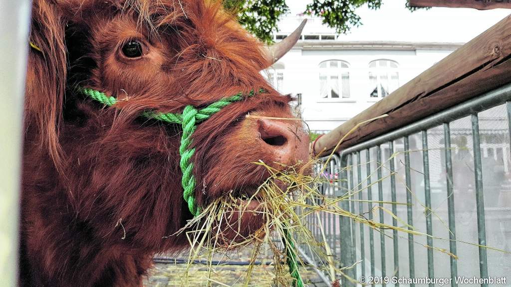 RINTELN (ste). Mit was lockt man die Kinder in die Stadt zu einem Bauern- und Ökomarkt? Klare Antwort: Mit Tieren. Und so gab es rund um St. Nikolai wieder einmal viele Vierbeiner, die dankbar über die eine und andere Streicheleinheit waren. Die stattlichsten unter ihnen: Die Highlang-Cattle von Heiner Brand aus Volksen. Genüsslich kauten sie auf dem Heu, ließen sich am zotteligen Fell oder den imposanten Hörnern streicheln und waren die klaren Tagessieger im Kinder-in-die-Stadt-locken. Gefolgt von den kuscheligen Kaninchen von Arnold von Eulenburg und Lutz Hoppe. Die Dalmatiner ließen sich in stoischer Ruhe auf den Arm nehmen und streicheln. Auf der Kirchplatz-Südseite lockten Esel und Ponys und "tierisch gut" fanden auch viele mitgebrachten Vierbeiner das Fest, bei dem man am Stand des Rintelner Bauhofs Grünpflanzen gewinnen konnte, darunter auch Obst-Hochstämme. Die Ackerbürger hatten ihre historischen Ackermaschinen mitgebracht und droschen die Ähren im "Raussendorf Favorit". Gleich gegenüber hatten sie ihren fahrbaren Steinbackofen kräftig vorgeheizt und dort gab es frischen Kuchen. Die "Lippischen Pickertfreunde" sorgten mit der lippischen Spezialität sowie Kartoffelpuffern für kulinarische Abwechslung, wobei allerdings die Beigabe "Leberwurst" zum Pickert für manache Geschmäcker zu exotisch war. Immer wieder ein echter Hingucker ist der bunte Blumenmix am Eingang des Marktplatzes, aufgebaut von der Rosenbaumschule "Fechner" aus Krankenhagen. Viele Hofläden wie der von "Kampmeier" aus Uchtdorf oder Giese aus Exten warben für ihre Produkte, die Landesforsten hatten Wildbratwürste im Angebot und der NABU informierte über seine Projekte, ebenso wie die Stadtwerke, die über E-Mobilität berieten und Nistkästen nach Anleitung mit den Kindern bauten. Am Sonntag hatten zudem noch die Innenstadtgeschäfte verkaufsoffen, so dass man zum Herbst hin das eine oder andere Sommerschlussverkaufsschnäppchen machen, oder sich mit der neuen Kollektion für die kälteren Tage eindecken konnte. Foto: ste