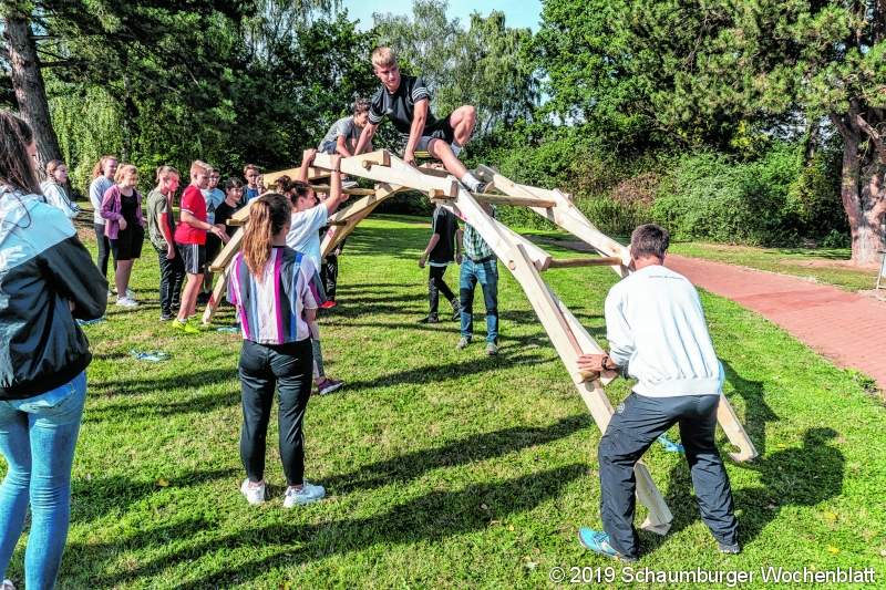 RINTELN (ste). Leonardo da Vinci (1452 bis 1519) war Maler, Architekt, Anatom, Bildhauer, Mechaniker und Naturphilosoph; er gilt als einer der berühmtesten Universalgelehrten aller Zeiten. Eine seiner Ideen und Erfindungen war die sogenannte "Leonardo Brücke", eine Konstruktion, die nur auf den Prinzipien von Druck und Gegendruck basiert und die komplett ohne Schrauben, Nägel der Drähte auskommt und bei der sich die Bauteile durch geschickte Verschränkung gegenseitig stützen. Diese Brücke entdeckte Gymnasiallehrer Sven Rundfeldt bei einem Gospelkonzert in der Eisberger Kirchengemeinde und war so fasziniert von der Kontruktion, dass er zusammen mit Frauke Schade und Hauke Plutte bei Schulleiter Andre Sawade vorsprach und auch ihn mit der Idee ansteckte, eine solche Brücke im Gymnasium nachzubauen. Besonders die Teambildungsprozesse beim Bau einer solchen Brücke reizten Rundfeldt und seine Mitstreiter. Die Bau-Premiere war jetzt mit Schülerinnen und Schülern der 9. Klassen im Wahlpflichtkurs Sport und auf Anhieb klappte es prima, die selbsttragende Brückenkontruktion zusammenzubauen. Ganz Mutige wagten sogar eine Brückenüberquerung und stellten fest, wie stabil sie konstruiert ist. Foto: privat