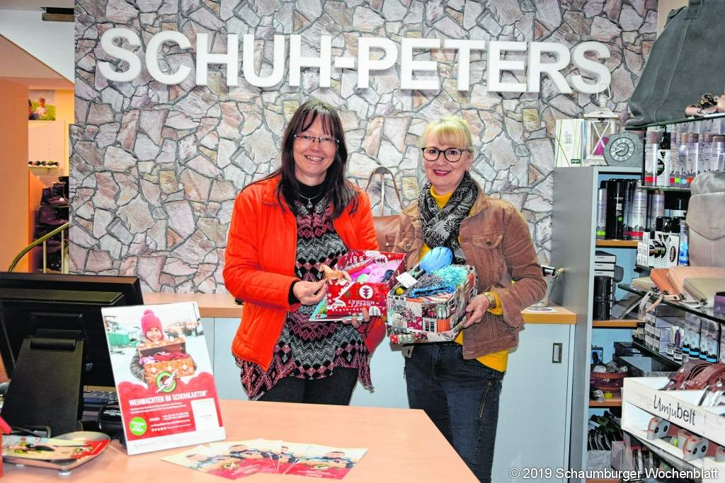 RINTELN (ste). Seit mehr als zehn Jahren beteiligt sich Claudia Döpke von "Schuh Peters" an der Aktion "Weihnachten im Schuhkarton", eine Geschenkaktion der "Samaritan's Purse". Die Geschenkaktion beschenkt Kinder, die teilweise zum ersten Mal ein Weihnachtsgeschenk bekommen. "Allein aus dem Schaumburger Raum kommen so jedes Jahr 1.000 gepackte Schuhkartons zusammen", so Corinna Brockhaus, die die gepackten Kartons weiterleitet. Wer noch ein Päckchen abgeben möchte, bekommt weitere Infos bei "Schuh Peters" oder im Internet unter www.weihnachten-im-schuhkarton.org. Foto: ste