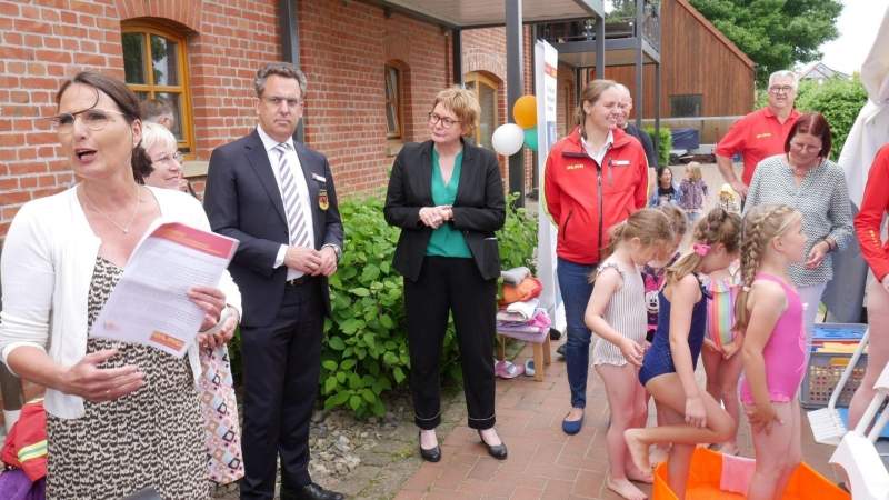 Fortsetzung vom Titel Bad Nenndorf: Zwei Wochen steht das Schwimmbecken zunächst an der Kindertagesstätte in Hohnhorst mit zwei qualifizierten Ausbildern zur Verfügung, bevor sie mit zumeist ehrenamtlichen Schwimmtrainer auf Reisen gehen. Abgestimmt auf das Alter der Kinder, finden pro Gruppe und Tag 30 bis 45 Minuten Wassergewöhnungseinheiten statt. Eine Gruppe besteht hierbei aus fünf bis sechs Kindern. Bei den Drei- bis Vierjährigen liegt der Fokus auf der Wassergewöhnung. Sie lernen das Element spielerisch durch Strampeln, Blubbern und verschiedene Spiele im Wasser kennen. Bei den Fünf- und Sechsjährigen geht es, je nach Leistungsstand, zur Wasserbewältigung über. Dazu gehört unter anderem ins Wasser zu springen, Gegenstände pustend weiterzutreiben oder das Ab- und Auftauchen im Wasser. Pro Gruppe werden fünf Lerneinheiten vermittelt, in denen schrittweise die Freude an der Bewegung im Wasser vertieft wird, denn "Schwimmen lernen setzt Angstfreiheit im Wasser voraus", erklärt Thren. In vier Monaten können etwa 640 Kinder je Pool und 2.560 Kinder insgesamt an das Wasser gewöhnt werden. "Wir freuen uns sehr, dass wir diese Möglichkeit bekommen, unseren Kindern im Alter zwischen drei und sechs Jahren diese Wassergewöhnung zu anzubieten", betont Ulla Sommer, die Leiterin der Honhorster Einrichtung auch im Namen der weiteren Mitarbeiterinnen. Mit Umsicht sorgt sie gleichfalls dafür, dass Zeiträume, in denen die eigene Einrichtung den Pool nicht nutzen kann, trotzdem zum Einsatz kommt. Sie bietet sie einem weiteren Kindergarten in Haste an. "Wir freuen uns sehr darüber, dass wir diese Zeiten für die zukünftigen Schulkindern des integrativen Kindergartens in Haste nutzen können", sagt Ilka Klingenberg, die Leiterin der dortigen Einrichtung. Allen Kindern wird im Nachgang die Möglichkeit eröffnet, verkürzten Schwimmkursen bei der DLRG auch die Schwimmabzeichen zu erwerben. Die Zahl der Nichtschwimmer nimmt in Deutschland auffallend zu, schildern die Vertreter der DLRG. Fast 60 Prozent der Zehnjährigen sind derzeit keine sicheren Schwimmer. Das heißt, sie verlassen die Grundschule ohne das Schwimmabzeichen in Bronze für Freischwimmer. Foto: gk