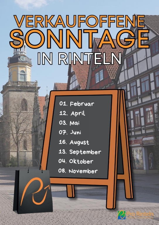 Am 01.02., 12.04., 03.05., 07.06., 16.08., 13.09., 04.10., und 08.11.2026 öffnen viele Geschäfte in Rinteln zum Sonntags-Shopping in der Zeit von 13.00 bis 18.00 Uhr.