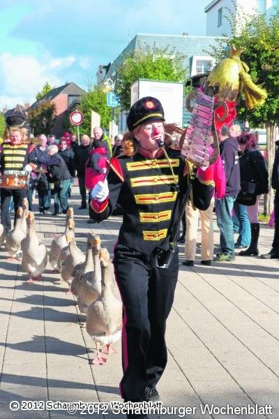 Trachten und Blasmusik empfingen die Gäste und auch das alte Handwerk rund um das Korb- und Stuhlflechten, Stickerei und Honig-Produktion fand höchste Aufmerksamkeit. Während der alte Baumbestand lautlos ein buntes Blatt nach dem anderen fallen ließ, regierte viel Bewegung und Trubel auf der neugestalteten Promenade. Holzspielzeug, Blumenarrangements, Edel- und Heilsteine, Dosenwurst und Körnerkissen, wie auch eine Dekorationsvielfalt für das Heim waren zwischen Palmen und Herbst-Impressionen auszumachen. Tierisch kuschelig ging es ebenfalls in dem bunten Gesamtbild zu. Der Alpakahof aus Barntrup stellte der Öffentlichkeit seine Therapie-Tiere vor und lud zu wollreichen Aktionen ein und mit vornehm gefiederten Geflügel brillierte Züchter Maximilian Kopp aus Porta Westfalica. Streichelziegen und Pony-Reitvergnügen komplettierten das Zoo-Erlebnis, welches durch die Gänsekapelle "Ganzenfanfare" aus den Niederlanden getoppt wurde. Im Gänsemarsch zog die Parade durch den Kurpark und erntete viele staunende und amüsierte Blicke.