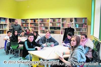 Die Bücherei erhielt eine komplett neue Ausstattung, die die Schüler in den Pausen einlädt zu lesen oder Hausaufgaben zu erledigen. Als Ansprechpartner steht den Schülern der freie Mitarbeiter Michael Hölscher zur Verfügung, der aktuell noch daran arbeitet die Bücher zu katalogisieren. Dieser ist sehr zufrieden mit der neuen Bücherei: "Mittags ist hier immer viel Verkehr", freute er sich über die starke Frequentierung. Sobald alle Bücher aufgenommen wurden und auch Lesekarten angefertigt sind, können die Schüler die Bücher auch ausleihen und zu Hause lesen. Die Leitung der Bücherei soll nach und nach in die Hände von Alexandra Jaksik und einer Schüler-AG fließen. Zur Anschaffung weiterer Bücher wollen die Verantwortlichen zunächst Umfragen durchführen. Die Schüler der Jahrgänge sieben und zehn haben sich schon Gedanken gemacht, sie wünschen sich: Romane, Jugendliteratur, Krimis, Komiks, Fantasy, Geschichtsbücher und historische Romane. Langfristig wünscht sich die Direktorin noch eine Ergänzung der Ausstattung: "Hier soll ein Internetcafé entstehen, indem die Schüler recherchieren können".