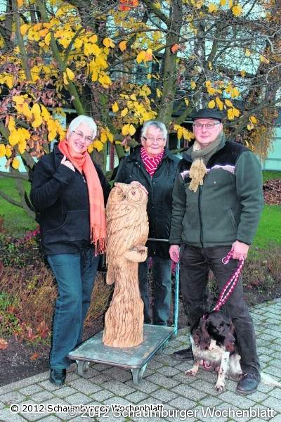 Über ihren Preis freute sich Dorothea Kerzel von ganzem Herzen, als Forstamtsleiter Lothar Seidel ihr die Eule überreichte. Geschnitzt wurde diese vom Forstwirtschaftsmeister Karl-Heinz Knigge aus Stiehleiche aus dem Schaumburger Wald. Schnell ist nicht nur der Ort gefunden, an dem die Eule zukünftig aufgestellt werden soll, sondern auch der Name der Eule: Seidels Hund Merlin wird kurzerhand zum Namensvetter der Holzeule.