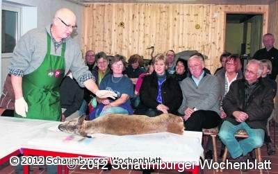 Begrüßt wurden die rund 20 Teilnehmer von Lothar Seidel, Kreisforstamtsleiter und den Küchenmeistern Rolf und Martin Parno vom Restaurant "Zum dicken Heinrich" im Forsthaus Halt. Aufgrund der großen Nachfrage ließen sich die Profis in diesem Jahr gleich zweimal über die Schulter schauen. Ziel dieser seit neun Jahren stattfindenden Kurse ist es, die Hemmschwellen abzubauen und das lecke Wild in die Schaumburger Küchen zu bringen. Die Teilnehmer erhielten dabei einen umfassenden Einblick vom "aus der Decke schlagen", sprich dem Fellabziehen, über das "Zerwirken", dem Zerteilen des Rehs in Stücke wie Keule und Rücken, bis hin zur Verarbeitung in der Küche.