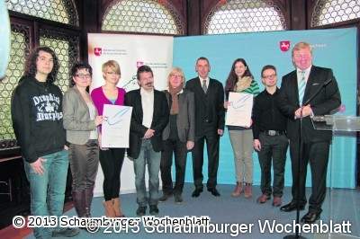 HANNOVER/STADTHAGEN (mh). Es ist eine Frage die schmerzt, dennoch haben die Schüler des deutsch-polnischen Theaterprojektes des Ratsgymnasiums Stadthagen sie gestellt: "Wo war Gott, als der Holocaust geschah?". Für ihr Engagement haben die Schüler gestern aus den Händen von Kultusminister Bernd Althusmann den dritten Preis des Schülerfriedenspreises entgegengenommen. Neben der Stadthäger Vertretung aus Schülern und Lehrern war auch Marzena Wojtkowiak, Lehrerin der polnischen Partnerschule in Slupca, zu der feierlichen Preisverleihung in das Gästehaus der Landesregierung in Hannover gekommen. "Auch unsere Schüler haben sich sehr gefreut. Es ist eine große Ehre einen Preis in Deutschland zu bekommen", berichtete die polnische Pädagogin. An dem Theaterprojekt haben rund 30 Schüler – je zur Hälfte aus Polen und Deutschland – teilgenommen. Ersten Auftritten in Stadthagen und Slupca folgten im vergangenen Jahr zudem Aufführungen in Auschwitz und Bergen-Belsen.