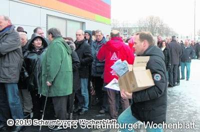STADTHAGEN/LANDKREIS (bb). IG-Metall und Faurecia-Betriebsrat haben den Besuch von Kanzlerin Angela Merkel und Ministerpräsident David McAllister genutzt, um auf die geplante Streichung von 200 Arbeitsplätzen am Werk in Stadthagen aufmerksam zu machen. Sie informierten die vor der Festhalle wartenden Veranstaltungsgäste und suchten das Gespräch mit Merkel und McAllister. So setzte McAllister das Thema Faurecia auch an den Anfang seiner Rede. Er erwarte von der Faurecia-Geschäftsführung ein klares Bekenntnis zum Standort in Stadthagen, erklärte der Ministerpräsident und bezog damit erneut Position gegen die Entlassungen. Das Beschlagwerk solle weitergeführt, die Zentrale gestärkt werden. Sowohl er als auch die Kanzlerin seien in ihren Dienstwagen des Typs Audi A8 auf Autositzen aus Stadthagen unterwegs. Dies solle so bleiben. Auch Angela Merkel erklärte, sich "im Rahmen ihrer Möglichkeiten" für die Belegschaft einzusetzen.Foto: bb