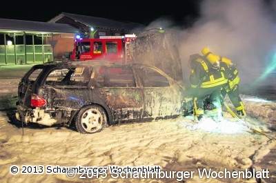 STADTHAGEN (mh). Ein brennender Mercedes Kombi hat die Polizei in der Nacht zu Freitag, 18. Januar, vor ein Rätsel gestellt. Der Wagen stand gegen 2.10 Uhr im Stadthäger Allerfeld und brannte lichterloh. Nachdem die Feuerwehr die Flammen gelöscht hatte, stellten die Polizeibeamten Spuren eines Unfalls am Auto fest.