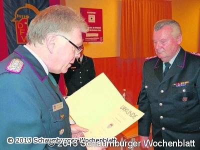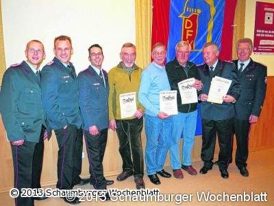 Die Kinderfeuerwehr um Marco Tannigel traf sich in ihrem fünften Jahr zu gemeinsamen Aktionen, Ausflügen und Spielen. Auch Preußing berichtete von zahlreichen Diensten rund um allgemeine Jugendarbeit mit Sport und gemeinschaftliche Aktionen, wie auch Wettbewerben und feuerwehrtechnische Einheiten. Drei Einsätze meldeten die Aktiven. Im letzten Jahr sorgten eine Gasexplosion in einem Wohnhaus und zwei Fehlalarme für das Ausrücken. Der Umbau des Feuerwehrhauses ist endlich abgeschlossen. In 2012 brachten die Feuerwehrleute besonders die sanitären Anlagen auf Vordermann. Sie leisteten neben Beruf, Familie und freiwilligem Feuerwehrdienst viele weitere Stunden an ehrenamtlichem Engagement. In 2013 erfolgt die energetische Sanierung des Gebäudes. Es wird gedämmt und neu gestrichen. Diese Arbeiten übernehmen Fachfirmen im Auftrag der Samtgemeinde. Samtgemeindebürgermeister Bernd Reese informierte, dass die Fachausschüsse sachlich und zielorientiert den Haushalt-Beschluss 2013 gefasst haben. Zusätzliche Einnahmen im Bereich der Feuerwehren stellte Reese durch eine geänderte Gebührensatzung in Aussicht. Aufgrund neuester rechtlicher Rahmenbedingungen erhebt die Samtgemeinde künftig bei Fehlalarmen von Brandmeldeanlagen eine Gebühr. Der Gesetzgeber erhofft sich dadurch eine insgesamt bessere Wartung und eine Reduzierung der Fehlalarme. Die Feuerwehrleute Roland Britz, Sven Döpke, Steffen Preußing, Marco Tannigel und Michael Zimmermann erhielten von Bernd Reese ihre neuen Feuerwehrführerscheine. Ebenfalls durch eine Gesetzesänderung ist es möglich geworden, durch eine Zusatzausbildung die Berechtigung zu erwerben, im Ernstfall Einsatzfahrzeuge bis 7,49 Tonnen zu führen, auch wenn der normale Führerschein dieses nicht vorsieht. Abschnittsleiter Uwe Blume beförderte Ortsbrandmeister Kim Röhrbein zum Oberbrandmeister. Sein Stellvertreter Lars Hecht erhielt durch Gemeindebrandmeister Friedhelm Möller die Beförderungsurkunde zum Ersten Hauptlöschmeister und Stephan Gerland erhielt den zusätzlichen Stern zum Oberlöschmeister. Mit dem Ehrenzeichen des Landesfeuerwehrverbandes für 50-jährige Mitgliedschaft zeichnete Blume den Hauptfeuerwehrmann Wolfgang Helmerding aus der seit 1963 bis zum Erreichen der Altersgrenze aktives Mitglied der Feuerwehr war. Für 50-jährige fördernde Mitgliedschaft ehrte der Ortsbrandmeister Lothar Struckmeier und würdigte die 40 –jährige Unterstützung von Erwin Nolte und Werner Tatge.