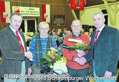 einem Vierteljahrhundert. Sie alle wurden mit Ehrennadeln ausgezeichnet. Eine "Sonderehrung" erfuhren Herbert Engelking und Willi Bruns, die der Vorsitzende als die "Seelen des Vereins" bezeichnete. Engelking als Mann für alles rund um die Sportanlage und Bruns als Wirt des Vereinsheims haben sich intensiv und nachhaltig über viele Jahrzehnte ehrenamtlich für den Verein eingesetzt. Rohrsen dankte zusammen mit Heinrich Bruns beiden für ihre langjährige Tätigkeit und überreichte Urkunden und Geschenke als Zeichen des Dankes. In seinem Bericht an die Versammlung erwähnte Eckhard Rohrsen die Austritte einiger Mitglieder im vergangenen Jahr. Als Konsequenz daraus forderte er, der Verein müsse seinen Mitgliedern ein attraktives Angebot unterbreiten, um so die Mitgliederzahl stabil zu halten. Im Jugendbereich sieht der TuS-Chef Probleme, die durch den zunehmenden Nachmittagsunterricht an den Schulen verursacht würden. Rohrsen stellte der Versammlung die Idee einer Hohnhorst- oder Jugendcard vor. Diese würde es möglich machen, dass junge Sportler, wenn sie Mitglied eines Vereins wären, in einem anderen Verein schnuppern könnten. Bürgermeister Wolfgang Lehrke (SPD) griff in seinem Grußwort diesen Gedanken auf und verlieh der Hoffnung Ausdruck, dass diese Idee nach Gesprächen im Ort mit einem positiven Ergebnis abgeschlossen werden kann.