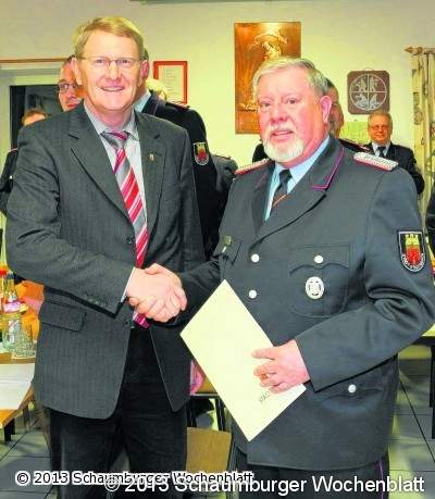 OBERNWÖHREN (wtz). Eine ganz besondere Ehrung nahm Bürgermeister Bernd Hellmann während der Jahreshauptversammlung der Feuerwehr Obernwöhren vor. Gerade noch "just in time" war er erschienen, um Günther Stahlhut zum Ehrenortsbrandmeister der Wehr zu ernennen.