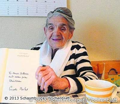 STADTHAGEN (em). Als große Verehrerin der CDU-Vorsitzenden und Bundeskanzlerin, Dr. Angela Merkel, war es für die 100-jährige Stadthägerin, Anna Sallum, selbstverständlich, dass sie am 14. Januar dieses Jahres an der Veranstaltung mit der Kanzlerin in der Festhalle in Stadthagen teilnahm. Das war für die hochbetagte Dame ein ganz besonders schönes Ereignis. Enttäuscht zeigte sie sich jedoch hinterher, da sie die Biographie über Angela Merkel von Gerd Langguth, die sie extra mitgebracht hatte, nicht signiert bekam. "Wir saßen einfach zu weit vom Gang entfernt", so ihr Enkel Christian Loos, "so dass wir keine Chance hatten, die Kanzlerin anzusprechen und um ein Autogramm zu bitten." Loos wandte sich mit seinem Anliegen an die CDU Kreisgeschäftsstelle in Stadthagen. Die Mitarbeiterin dort, Marita Gericke, setzte sich mit dem Büroleiter der Kanzlerin in Berlin in Verbindung und trug das Anliegen der 100-jährigen Dame vor. Der Büroleiter versprach, den Wunsch von Anna Sallum an die Kanzlerin weiter zu geben. Nachdem das Buch dorthin gesandt wurde begann das Warten, ob die Kanzlerin diesem Herzenswunsch der 100-Jährigen wohl nachkommen würde. Sie tat es.