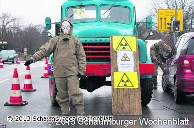 LANDKREIS (wa). Eine furchterregende Sirene heult auf. Männer in schlammfarbener Schutzkleidung und Atemschutzmaske, lotsen herannahende Autofahrer nacheinander von der mittig abgesperrten Straße zu sich heran. Ein mulmiges Gefühl macht sich breit. Für Fragen bleibt keine Zeit. Mittels Geigerzähler wird der "Strahlenwert" des Wagens gemessen und anschließend mit Wasser abgespritzt. Nach einer kurzen "Einweisung" und einem Handzettel darf weiter gefahren werden. Ausnahmezustand auf der Bundesstraße 65. Nicht jeder wusste Bescheid über die Protest-Aktion verschiedener Bündnisse gegen das AKW Grohnde am vergangenen Sonnabend. In ganz Schaumburg, Hannover und auch Minden sind die Menschen auf die Straße gegangen, um mit verschiedenen Aktionen die Abschaltung des AKW in Grohnde zu fordern. Die Dekontaminierungsstelle in Sülbeck sorgte mit gelungenem Überraschungseffekt und "Leiche" auf der Straße für erstaunte Gesichter. Lesen Sie mehr auf Seite 3