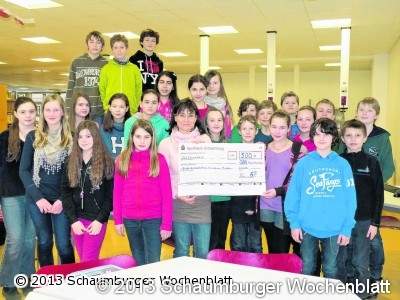 Die Schülerinnen und Schüler haben für den "Tag der offenen Tür" der Schule an der Horster Straße eine Tombola organisiert und am Ende 500 Euro für die Kinder-Krebsstation des Klinikums in Minden erwirtschaftet. Das Geld ist an die Organisation "Eltern krebskranker Kinder" übergeben worden. In der Hauptsache soll von dem Geld Spielzeug für die kleinen Patienten angeschafft werden. 375 Preise haben die Gymnasiasten bei Banken, in Geschäften, Restaurants, Blumengeschäften oder Cafés "erbettelt", wie es Frers-Jung ausdrückte. Zusammen mit ihrer Lehrerin Renate Preuß haben die Jungen und Mädchen beim "Tag der offenen Tür" die Lose schnell verkaufen können. Die schönen Preise gingen rasch an neue Besitzer über. Die Idee, die Einnahmen für die Kinder auf der Krebsstation in Minden zu spenden, lag nahe. Ein Mitschüler der Klasse hat selbst einige Zeit dort gelegen und gegen die schlimme Krankheit gekämpft. Das Ziel, möglichst viel Geld für den guten Zweck zusammen zu bekommen, war große Motivation für die Sechstklässler. Bei der Geldübergabe schilderte der Mitschüler seine Erlebnisse auf der Station während der Chemotherapie. Claudia Driftmann von der Organisation "Eltern krebskranker Kinder" erzählte ihrerseits von Erfahrungen und beantwortete auch gerne die Fragen der Schülerinnen und Schüler. Zuvor bekam sie von den beiden Klassensprechern Julius Luther und Alida Franz den überdimensionalen Scheck und einen Umschlag mit den 500 Euro überreicht. Foto: pd