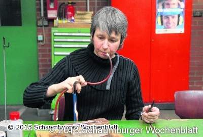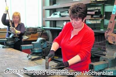 Mit schwererem Gerät bearbeiteten die Frauen im Kurs "Schweißen und Dengeln" unter der Anleitung von Fachpraxislehrer Erhard Büsking ihren Werkstoff. Die Teilnehmerinnen schnitten Bleche und bearbeiteten sie mit schweren Hämmern. Nebenan flogen beim Schweißen die Funken.