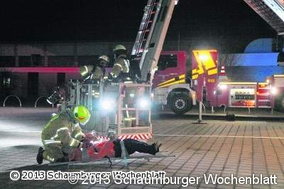 STADTHAGEN (bb). Rund 30 Feuerwehrleute der Stadthäger Wehr haben bei einer Übung an und in der Kreissporthalle in der Schachtstraße am Montagabend für den Ernstfall trainiert. Unter anderem kam dabei die neue Hubrettungsbühne zum Einsatz. Für die Feuerwehrleute galt es, vermisste Personen zu retten.