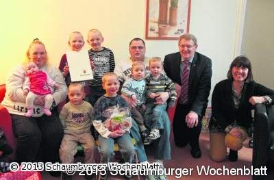 Bürgermeister Bernd Hellmann übergab die vom Bundespräsidenten unterschriebene Urkunde über die Ehrenpatenschaft im Familienzentrum an das Ehepaar Natascha und René Rebentisch. Die Koordinatorin des Zentrums Helga Freude hatte eine Reihe kleiner Stühle bereitgestellt, damit die sechs Söhne Florian (11), Pascal (8), Nico (6), Jannik (4), Leon (2) und Elias (1) Platz fanden. Die am 16. November geborene Pia-Sofie saß auf Mamas Schoß.