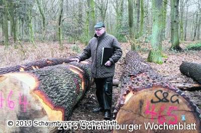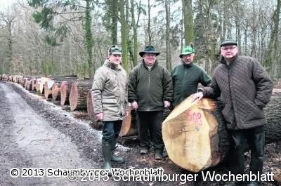 In zwei langen Reihen auf beiden Seiten des Waldweges in der Meinser Kämpe lagen die Baumstämme aufgereiht, viele im Querschnitt mehr als hüfthoch. So konnten die Interessenten über einen gewissen Zeitraum anreisen und die schwergewichtigen Qualitätsprodukte aus den heimischen Wäldern in Augenschein nehmen. Im Rahmen eines Auktionsverfahrens gaben diese dann Gebote für die Stämme ab, die sie in ihren Säge- und Furnierwerken weiterverarbeiten wollten. Lothar Seidel, Leiter des Kreisforstamtes des Landkreises, und Manfred Quer von der Schleswig-Holsteinischen Holzagentur betonten, dass diese "Holzsubmission" auch in diesem Jahr sehr erfolgreich verlaufen sei. Rund 626 Festmeter Eichenholz waren in der von der Schleswig-Holsteinischen Holzagentur organisierten Submission angeboten worden. Hinzu kam ein Stamm, drei Festmeter, Eschenholz. Die Interessenten gaben für alle Stücke Gebote ab und so wurden alle veräußert, dabei insgesamt rund 256 000 Euro erlöst. Die Bäume wurden in den Wäldern des Kreisforstamtes Spießingshol, des Fürstlichen Forstamtes Bückeburg, des Stadtforstes Rehburg und der Forstgenossenschaft Wiedensahl geschlagen. Insgesamt gaben die zwölf Interessenten 2207 Gebote für 363 zum Verkauf stehende Einheiten ab. Offenbar bestand also eine hohe Nachfrage nach dem Eichenholz aus der Region Schaumburg/Nienburg. Dies sei Ausdruck der hohen Qualität des heimischen Eichenbestandes, wie Lothar Seidel, Manfred Quer und die übrigen Forstfachleute festhielten. Die Käufer stammen aus dem gesamten Bundesgebiet und zum Teil aus dem benachbarten Ausland und werden das Holz für den Qualitätsmöbelbau und den gehobenen Innenausbau verwenden.