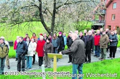 Er dankte seinen vielen ehrenamtlichen Helfern, die tatkräftig beim Pflanzen der vielen Kirschbäume geholfen haben. 60 neue Bäume säumen den Rundwanderweg, alles alte Sorten und in einer Baumschule veredelt. Unter ihnen sind so großartige Namen wie "Bernsteinkirsche", "Knauffs Frühe Schwarze" oder auch die seltene Ochsenherzkirsche oder die "Weiße Spanische".
