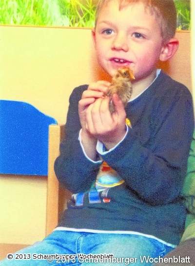 Alle saßen gespannt und leise vor dem Brutkasten - piepsende Eier lassen sich schließlich nicht alle Tage beobachten. Nicht nur Kinder und Erzieher waren neugierig, auch die Eltern huschten ab und an ins Büro, um zu sehen, was sich dort abspielte. Nach und nach entstanden immer größer werdende Löcher, bis die Neuankömmlinge es schließlich aus dem Ei geschafft hatten. Nach 24 Stunden durften sie in den vorbereiteten Kükenstall mit Wärmelampe umziehen. Nun galt es wieder viele Dinge zu beachten, um die kleinen sicher aufwachsen zu lassen. Unterstützung gibt es dabei von Angelika Lange und Karl Fechtelkord aus dem Rodenberger Geflügelzuchtverein, die sowohl die Eier, als auch das Zubehör zur Verfügung gestellt hatten. Spaß und lehrreiche Momente hält die Aufgabe für alle bereit, die Teil des Projektes "Leben und Wachsen" ist.
