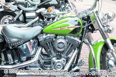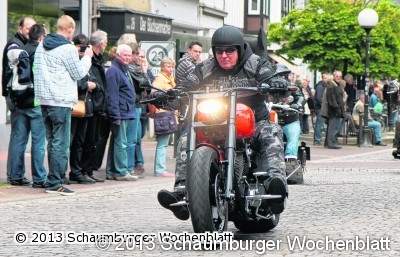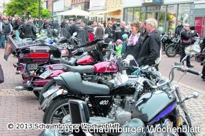 Hier war ein Totenkopf mit Spielkarten auf den Tank lackiert, dort prangten die Harley-Davidson-Schwingen. Bei einer Maschine war die Vorderrad-Gabel deutlich verlängert, beim nächsten Motorrad bildeten blitzende Niete am Sattel Hingucker. Angesichts der Wettervorhersage waren weniger Motorradfreunde als im Vorjahr mit ihren "Bikes" nach Stadthagen gekommen. Mit rund 120 Maschinen wurde immer noch eine stattliche Anzahl erreicht und bis zur Ausfahrt zur Mittagszeit blieb es trocken, so dass die Maifestgäste in Ruhe die Motorräder begutachten konnten. Den Schimmer polierter Speichen und verchromter Motoren hielten Viele mit der Handy-Kamera fest. Gern beantworteten die Besitzer Fragen zu ihren Motorrädern. Untereinander entwickelten sich Fachgespräche zu Konstruktionsdetails.